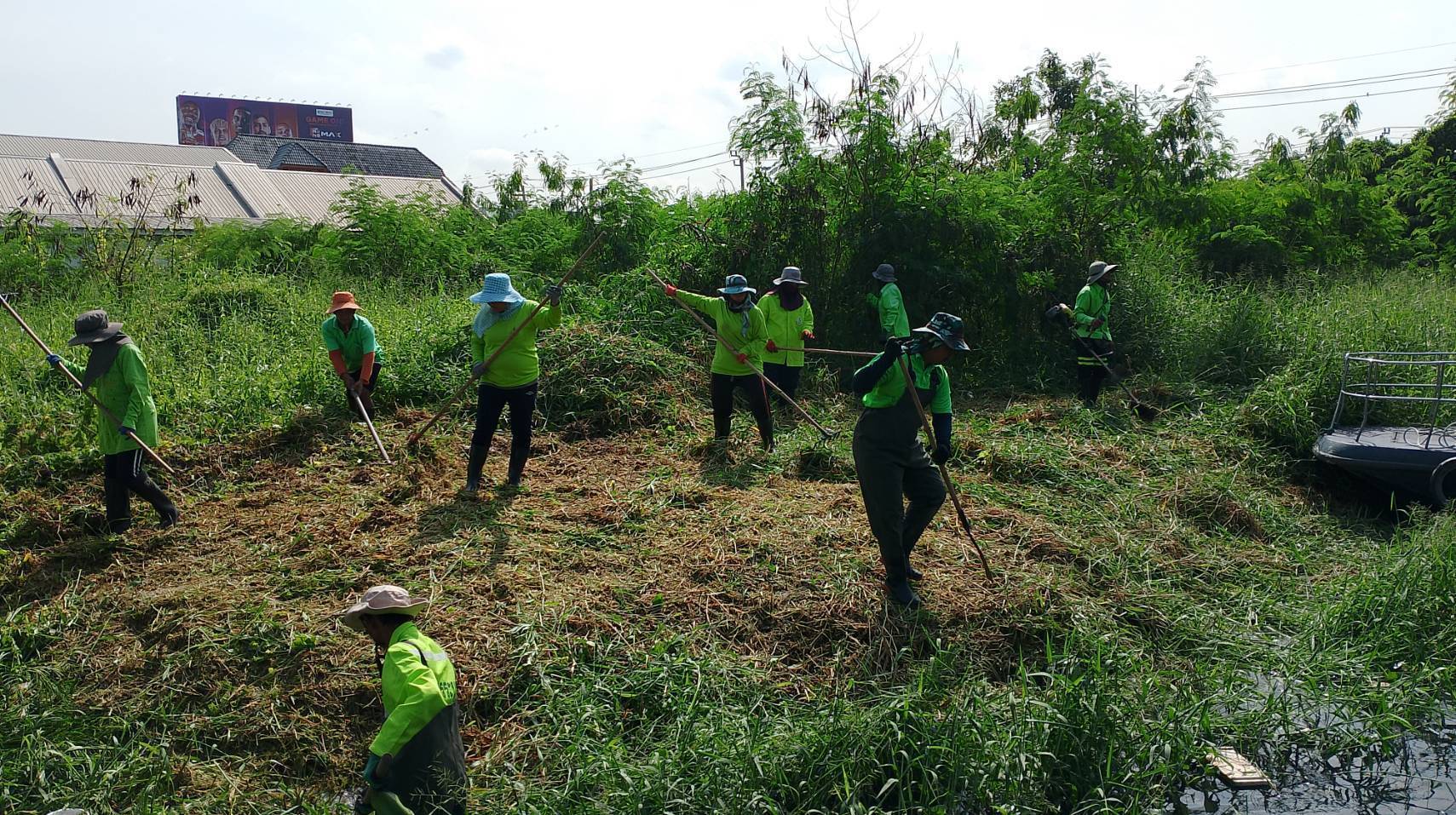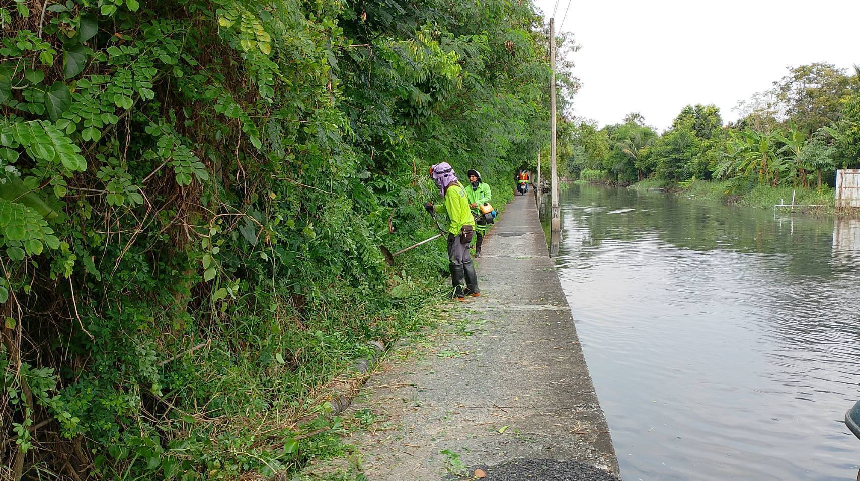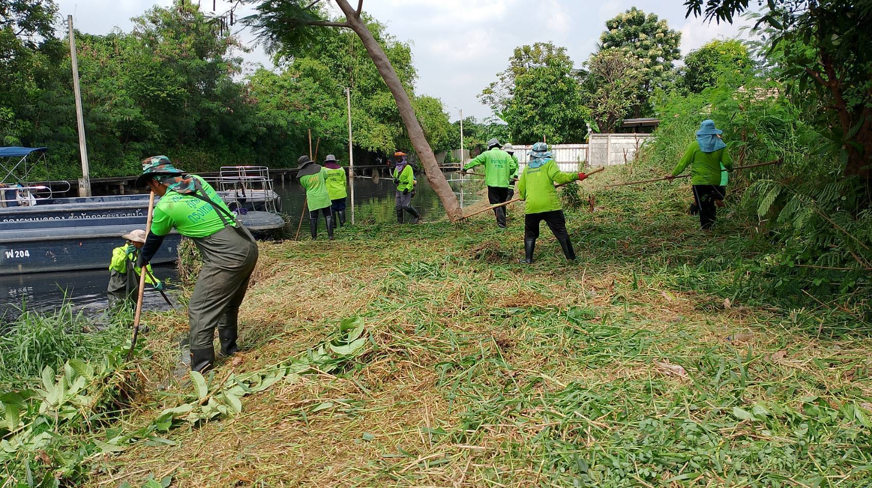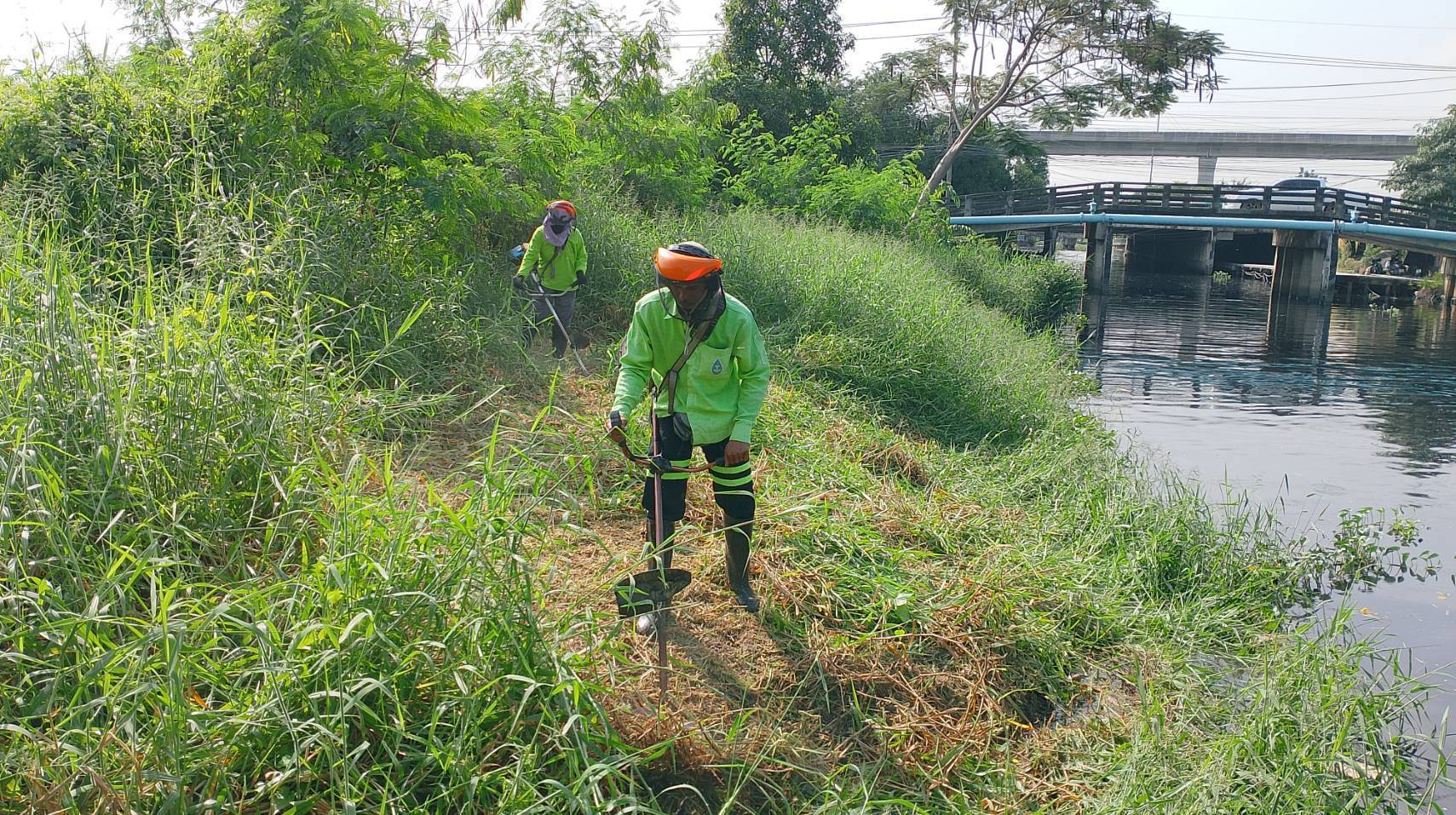 เจ้าหน้าที่ เก็บวัชพืชตัดหญ้าริมคลองหนึ่งมอเตอร์เวย์ เขตลาดกระบัง