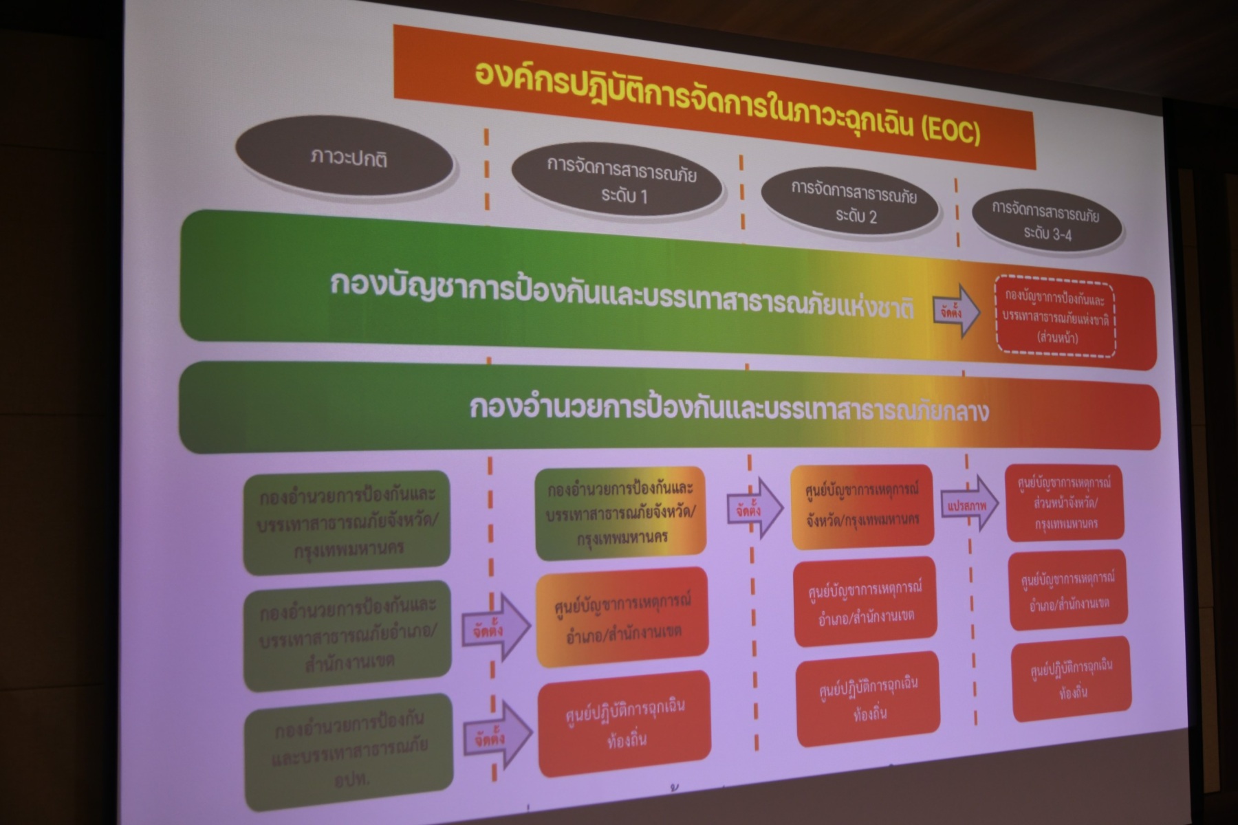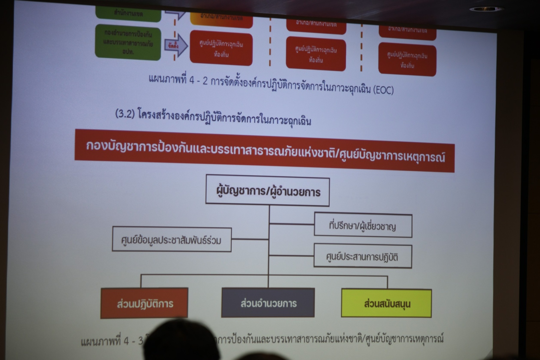 รองผู้ว่าฯ ทวิดา ได้เน้นย้ำถึงโครงสร้างและบทบาทหน้าที่ของกองอำนวยการป้องกันและบรรเทาสาธารณภัย ทั้งระดับเขตและระดับกรุงเทพมหานคร โดยเทียบกับแผนระดับชาติ พร้อมยกกรณีการจัดตั้ง EOC ในเหตุการณ์สาธารณภัย (แผ่นดินไหว) ที่ผ่านมาว่าเกิดปัญหาใดที่ควรนำบทเรียนมาปรับแก้ไขให้ดีขึ้น