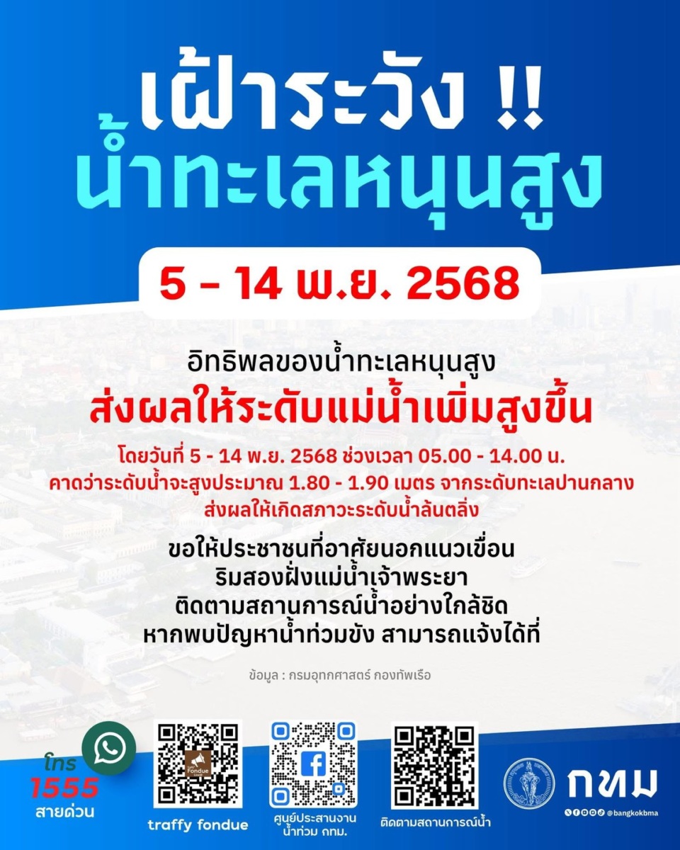 ทั้งนี้ สามารถดาวน์โหลดตารางเวลาน้ำขึ้นเต็มที่และน้ำลงเต็มที่ของแม่น้ำเจ้าพระยาในแต่ละวันทางเว็บไซต์ของสำนักการระบายน้ำ https://dds.bangkok.go.th/public_content/files/001/0006030_1.pdf และติดตามการแจ้งเตือนสถานการณ์น้ำได้ที่ https://pr-bangkok.com Facebook:@BKK.BEST สำนักงานประชาสัมพันธ์ Twitter:@BKK_BEST สำนักงานประชาสัมพันธ์ แจ้งเหตุความเดือดร้อนจากสถานการณ์น้ำในแม่น้ำเจ้าพระยา โทร. 0 2248 5115 และผ่านแอปพลิเคชัน Traffy Fondue ตลอด 24 ชั่วโมง รวมทั้งตามการคาดหมายสภาวะระดับน้ำแม่น้ำเจ้าพระยาได้ที่ https://www.hydro.navy.mi.th/3chaophraya/rtnhq.html อีกทั้งแจ้งเตือนประชาชนผ่านช่องทาง LINE Official Account “@bkk_flood” เพื่อขนย้ายสิ่งของ หรืออุปกรณ์ที่เกี่ยวกับระบบไฟฟ้าขึ้นสู่ที่สูงไม่ให้เกิดความเสียหายต่อไป
