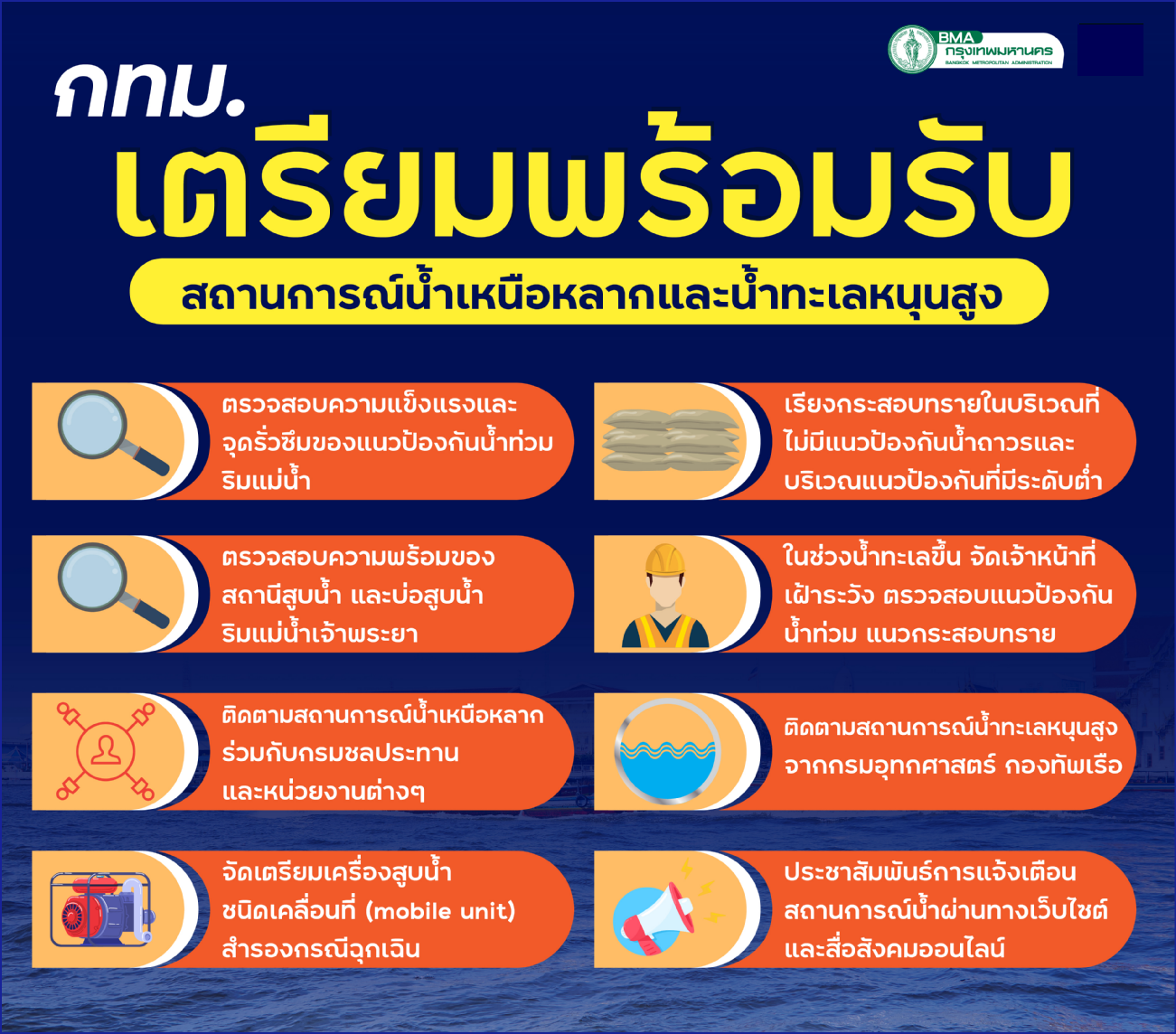 สำหรับการเตรียมความพร้อมตามแผนฯ ในช่วงที่น้ำจะขึ้นในแม่น้ำเจ้าพระยา ในแต่ละวันจะปิดประตูระบายน้ำตามแนวริมแม่น้ำและคลองต่าง ๆ ทุกแห่งที่ต่อเชื่อมกับแม่น้ำเจ้าพระยา จัดเจ้าหน้าที่ประจำจุดเสี่ยง พื้นที่ลุ่มต่ำตามแนวริมแม่น้ำหรือแนวชุมชน ท่าเรือ ร้านค้าและชุมชนนอกแนว จัดเตรียมเครื่องมือ วัสดุ อุปกรณ์ เครื่องจักร เครื่องสูบน้ำ รถบรรทุกกระสอบทราย และอุปกรณ์ช่วยเหลือต่าง ๆ จัดเตรียมความพร้อมด้านระบบระบายน้ำ ประกอบด้วยอุโมงค์ระบายน้ำ 4 แห่ง สถานีสูบน้ำตามแนวริมแม่น้ำเจ้าพระยาโดยในพื้นที่ฝั่งพระนคร 47 แห่ง และพื้นที่ฝั่งธนบุรี 49 แห่ง กำลังสูบรวม 1230.55 ลูกบาศก์เมตร (ลบ.ม.) /วินาที ตรวจสอบความพร้อมของประตูระบายน้ำสถานีสูบน้ำที่ตั้งอยู่ตามแนวริมแม่น้ำเจ้าพระยาให้สามารถทำงานได้เป็นปกติ ตรวจสอบความพร้อมของงานระบบไฟฟ้าและอุปกรณ์ควบคุม จัดเตรียมเครื่องมืออุปกรณ์ต่าง ๆ จัดเจ้าหน้าที่ประจำการตามสถานีสูบน้ำตลอด 24 ชั่วโมง ติดตามตรวจสอบสถานการณ์น้ำที่กำลังขึ้นโดยใช้ระบบการตรวจวัดระดับน้ำแบบเรียลไทม์เริ่มตั้งแต่ปากอ่าวไทยที่สถานีจุดวัดสถานตากอากาศบางปู จังหวัดสมุทรปราการ จนถึงสถานีสูบน้ำปากคลองตลาด (บริเวณใกล้เคียงสะพานพุทธฯ) เขตพระนคร รวมถึงการตรวจวัดอัตราการไหลของน้ำที่จุดวัดสะพานพระราม 8 เขตบางพลัด