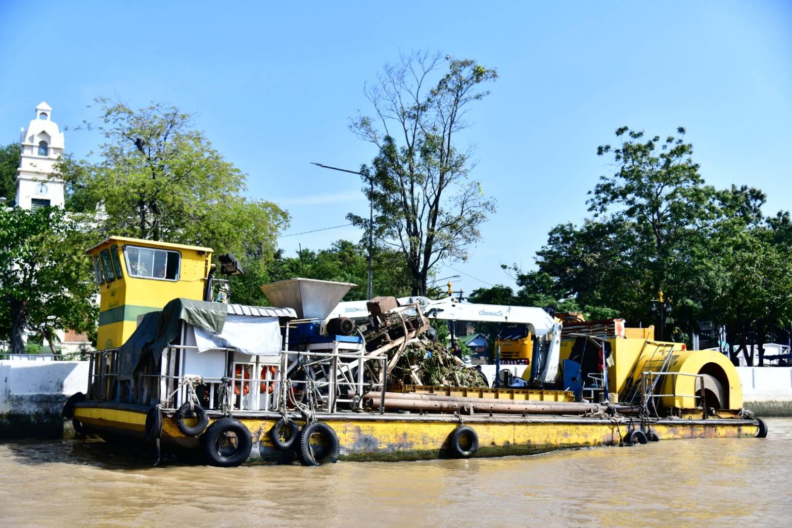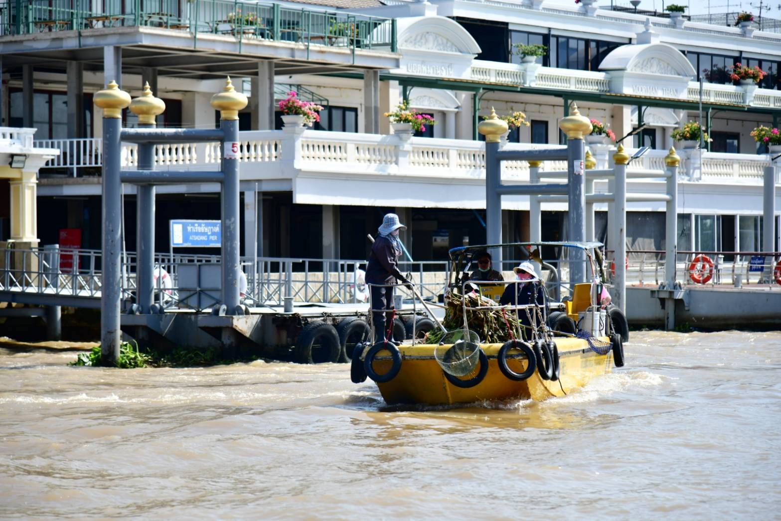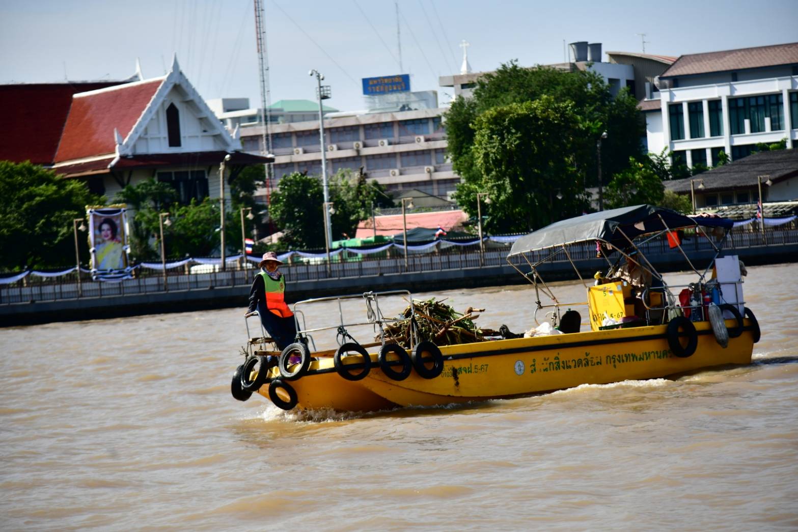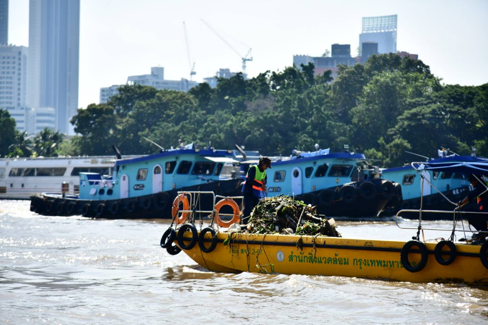 รองผู้ว่าฯ จักกพันธุ์ เปิดเผยว่า ในพื้นที่กรุงเทพมหานคร ตั้งแต่สะพานพระราม 7 ถึงสุดเขตบางนา ระยะทาง 33.25 กิโลเมตร และปากคลองบางกอกน้อยถึงปากคลองมหาสวัสดิ์ ระยะทาง 4.20 กิโลเมตร รวมระยะทางทั้งสิ้น 37.45 กิโลเมตร สำนักสิ่งแวดล้อมมีหน้าที่รับผิดชอบดำเนินการจัดเก็บมูลฝอย ผักตบชวา และวัชพืชที่ลอยอยู่ในแม่น้ำเจ้าพระยา โดยมีเจ้าหน้าที่รวมทั้งสิ้น 156 คน ปฏิบัติงานตั้งแต่เวลา 08.00-16.00 น. มีเรือจัดเก็บมูลฝอยทั้งหมด 43 ลำ ประกอบด้วย เรือไฟเบอร์กลาสเก็บขนมูลฝอย ขนาด 2 x 8 เมตร จำนวน 31 ลำ เรือเก็บขนขยะและวัชพืช ขนาด 4 x 14 เมตร จำนวน 2 ลำ เรือขนถ่ายและลำเลียงวัชพืช ขนาด 6 x 14 เมตร จำนวน 2 ลำ เรือขนถ่ายลำเลียงมูลฝอยและวัชพืช ขนาด 6.3 x 19 เมตร จำนวน 3 ลำ เรือกวาดเก็บมูลฝอยและวัชพืช ขนาด 3.5 x 14 เมตร จำนวน 3 ลำ เรือตรวจการณ์ จำนวน 2 ลำ มีจุดขนถ่ายมูลฝอยและวัชพืช จำนวน 2 จุด ได้แก่ บริเวณปากคลองโอ่งอ่าง สะพานพุทธฯ เขตพระนคร และคลังสินค้ากระทรวงพาณิชย์ เขตราษฎร์บูรณะ มีรถบรรทุกเทท้าย จำนวน 7 คัน รถบรรทุกเทท้ายติดเครนพร้อมอุปกรณ์ตักคีบวัชพืช จำนวน 1 คัน