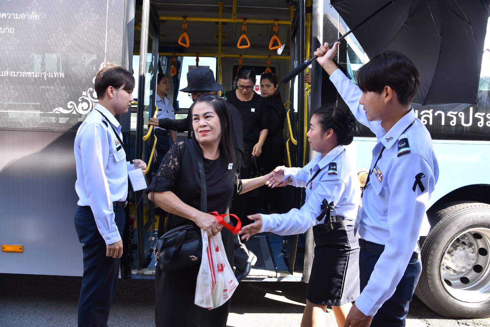 ด้านการเดินทาง ได้ร่วมกับกระทรวงคมนาคม จัดรถ ขสมก. เดินรถใน 16 เส้นทาง รวมทั้งเรือข้ามฟากและเรือด่วนเจ้าพระยา ให้บริการรับ–ส่งฟรี รวมถึงร่วมกับ กสทช. และ NT เปิดให้บริการสายด่วน 1818 โทรฟรี เพื่อให้ข้อมูลและคำแนะนำแก่ประชาชนเกี่ยวกับการเข้ากราบถวายบังคมพระบรมศพ ทั้งเรื่องเส้นทาง การแต่งกาย ช่วงเวลาเข้ากราบ และการร่วมบริจาคสิ่งของหรืออาหาร
