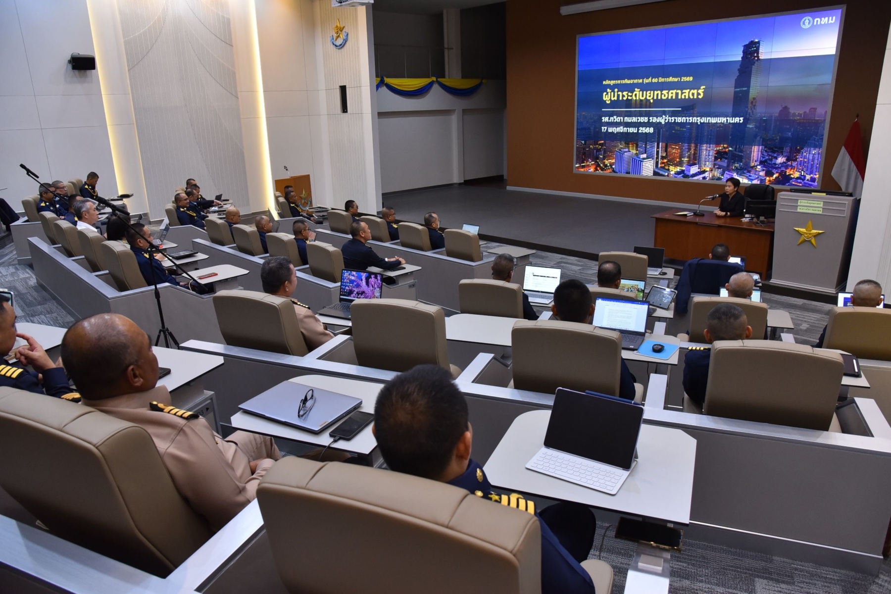 (17 พ.ย. 68) รศ.ทวิดา กมลเวชช รองผู้ว่าราชการกรุงเทพมหานคร บรรยายพิเศษ หัวข้อวิชา ผู้นำระดับยุทธศาสตร์ แก่ผู้เข้ารับการศึกษาหลักสูตรการทัพอากาศ รุ่นที่ 60 ประจำปีการศึกษา 2569 ณ ห้องบรรยายวิทยาลัยการทัพอากาศ กรมยุทธศึกษาทหารอากาศ เขตดอนเมือง ซึ่งการศึกษาหลักสูตรดังกล่าว วิทยาลัยการทัพอากาศ กรมยุทธศึกษาทหารอากาศ จัดขึ้นเพื่อให้ผู้เข้ารับการศึกษามีความรู้ ทั้งในด้านการเป็นผู้นำยุทธศาสตร์และการทหาร พร้อมเป็นผู้บังคับบัญชาและฝ่ายเสนาธิการระดับสูงที่มีคุณธรรมและจริยธรรม โดยผู้เข้ารับการศึกษามาจากหน่วยงานทางทหาร ตำรวจ ข้าราชการพลเรือน พนักงานภาครัฐ และนายทหารจากมิตรประเทศ