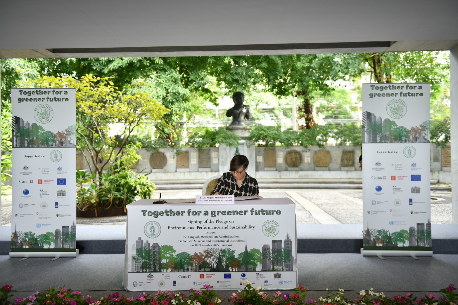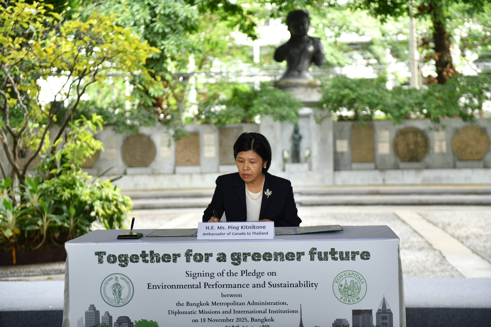 การลงนามในคำปฏิญาณว่าด้วยการดำเนินงานด้านสิ่งแวดล้อมและความยั่งยืนภายใต้โครงการ Eco-Capitals Forum เพื่อร่วมมือกันผลักดันให้กรุงเทพมหานครเป็นเมืองน่าอยู่สำหรับทุกคน โครงการ Eco-Capitals Forum มีเป้าหมายเพื่อสร้างความร่วมมือเชิงรุกด้านสิ่งแวดล้อมระหว่างกรุงเทพมหานคร สถานเอกอัครราชทูตต่างประเทศ และองค์การระหว่างประเทศในประเทศไทย ผ่านการดำเนินการตาม แผนการดำเนินงานด้านสิ่งแวดล้อม (Action Plan) ของแต่ละสถานเอกอัครราชทูต ภายใต้กรอบการดำเนินงาน 8 ด้าน ได้แก่ 1. การส่งเสริมการจัดการขยะมูลฝอย 2. การคมนาคม 3. การปรับตัวและการสร้างพื้นที่สีเขียว 4. การอนุรักษ์พลังงาน และการใช้พลังงานทางเลือก 5. การส่งเสริมการสร้างอากาศสะอาด 6. การใช้ทรัพยากรน้ำอย่างเพียงพอ 7. การส่งเสริมการบริโภคอาหารอย่างยั่งยืน 8. การบริหารจัดการและการส่งเสริมเศรษฐกิจสีเขียว กรอบการดำเนินงานดังกล่าวได้กำหนดขึ้นเพื่อให้สอดคล้องกับนโยบายสิ่งแวดล้อมดีของกรุงเทพมหานคร และสอดคล้องกับเป้าหมายการพัฒนาที่ยั่งยืน สถานเอกอัครราชทูตและองค์การระหว่างประเทศที่เข้าร่วมลงนามคำปฏิญาณในครั้งนี้ ประกอบด้วย สถานเอกอัครราชทูตออสเตรเลีย สถานเอกอัครราชทูตออสเตรีย สถานเอกอัครราชทูตแคนาดา สถานเอกอัครราชทูต เดนมาร์ก คณะผู้แทนสหภาพยุโรปประจำประเทศไทย สถานเอกอัครราชทูตฟินแลนด์ สถานเอกอัครราชทูตฝรั่งเศส สถานเอกอัครราชทูตสหพันธ์สาธารณรัฐเยอรมนี สถานเอกอัครราชทูตอิตาลี สถานเอกอัครราชทูตญี่ปุ่น สถานเอกอัครราชทูตเนเธอร์แลนด์ สถานเอกอัครราชทูตนอร์เวย์ สถานเอกอัครราชทูตสวีเดน สถานเอกอัครราชทูต สวิตเซอร์แลนด์ สถานเอกอัครราชทูตสหราชอาณาจักร และคณะกรรมาธิการเศรษฐกิจและสังคมแห่งสหประชาชาติ สำหรับเอเชียและแปซิฟิก (UNESCAP)