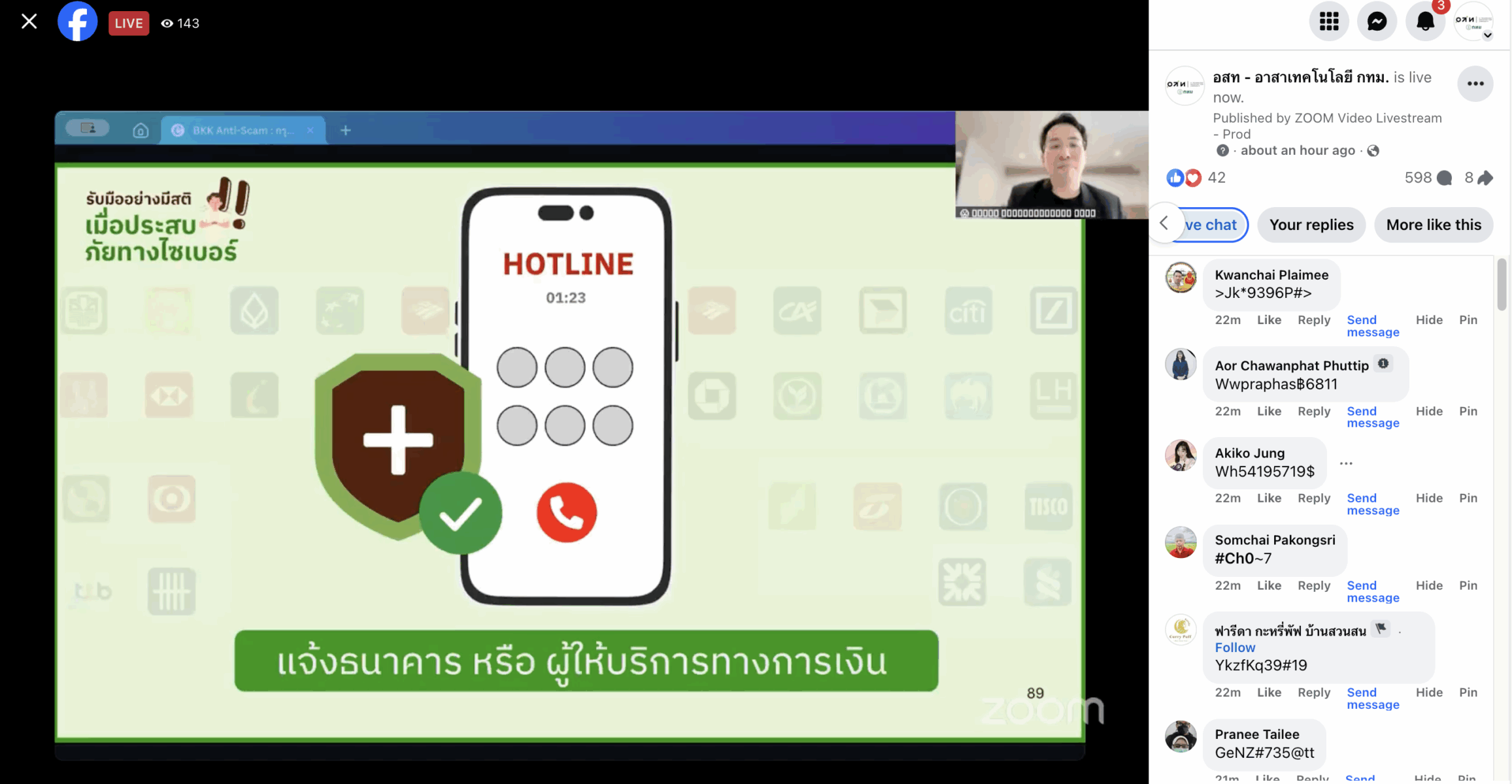 (18 พ.ย. 68) นายศานนท์ หวังสร้างบุญ รองผู้ว่าราชการกรุงเทพมหานคร เปิดเผยว่า กทม. ร่วมกับสำนักงานพัฒนาธุรกรรมทางอิเล็กทรอนิกส์ (ETDA) และชัวร์ก่อนแชร์ จัดการอบรมออนไลน์ “BKK Anti–Scam” ภายใต้โครงการ “BKK Anti–Scam : กรุงเทพฯ รู้ทันภัยออนไลน์” เพื่อให้ความรู้เรื่องภัยออนไลน์และแนวทางป้องกันตนเองจากมิจฉาชีพดิจิทัล แก่ อสท. และคณะกรรมการชุมชนทั่วกรุงเทพฯ โดยหัวข้อการอบรมในวันนี้ ประกอบด้วย การทำความเข้าใจการล่วงละเมิด และภัยคุกคามทางไซเบอร์รูปแบบต่างๆ, กิจกรรมรู้เท่าทันภัยออนไลน์ ผ่านการสอนแยกภาพจริงและภาพ AI และเทคนิคการตั้งพาสเวิร์ด (รหัสผ่าน) ให้ปลอดภัย ซึ่งเน้นให้ผู้เข้าร่วมได้เรียนรู้ผ่านกรณีศึกษาจริง และนำไปปรับใช้ในชีวิตได้ทันที โดยมีอาสาสมัครเทคโนโลยี (อสท.) และคณะกรรมการชุมชน มากกว่า 370 คน ร่วมเข้ารับการอบรม ผ่านระบบ Zoom Meeting และ Facebook Live
