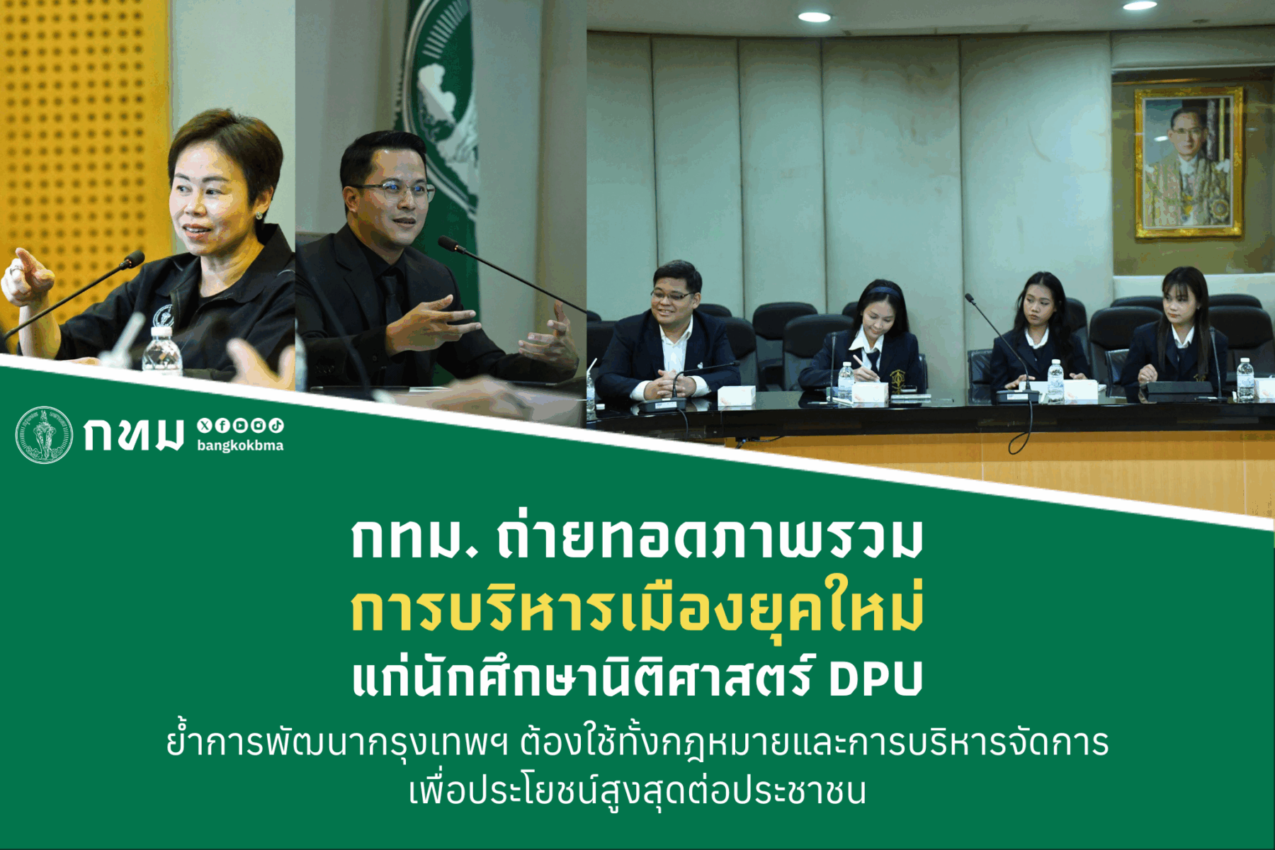 (18 พ.ย. 68) รศ.ทวิดา กมลเวชช รองผู้ว่าราชการกรุงเทพมหานคร และนายเนติภูมิ มิ่งรุจิราลัย รองประธานสภากรุงเทพมหานคร คนที่หนึ่ง (สมาชิกสภากรุงเทพมหานคร เขตบึงกุ่ม) ให้การต้อนรับคณะนักศึกษาดูงานจากคณะนิติศาสตร์ปรีดี พนมยงค์ มหาวิทยาลัยธุรกิจบัณฑิตย์ (DPU) นำโดย อาจารย์ ดร. บุญญภัทร์ ชูเกียรติ อาจารย์ประจำคณะฯ โดยมี นายวิฑูรย์ อภิสิทธิ์ภูวกุล ผู้อำนวยการสำนักยุทธศาสตร์และประเมินผล กรุงเทพมหานคร พร้อมผู้บริหารและเจ้าหน้าที่ที่เกี่ยวข้อง ร่วมให้การต้อนรับ ณ ห้องนพรัตน์ ชั้น 5 ศาลาว่าการกรุงเทพมหานคร (เสาชิงช้า) เขตพระนคร