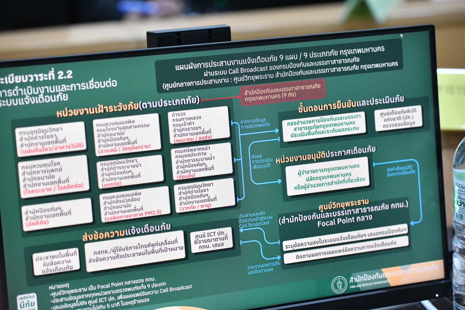 ที่ประชุมยังได้หารือถึงแผนผังการประสานงานแจ้งเตือนภัยสำหรับ 9 แผน 9 ประเภทภัยหลักของกรุงเทพมหานคร ประกอบด้วย ภัยจากการคมนาคมและขนส่ง ภัยจากอัคคีภัย ภัยจากสารเคมีและวัตถุอันตราย ภัยจากแผ่นดินไหวและอาคารวิบัติเชิงโครงสร้าง ภัยจากอุทกภัย ภัยจากภัยแล้ง ภัยจากภัยมลพิษทางอากาศประเภทฝุ่น PM2.5 ภัยจากภัยโรคระบาดและโรคติดต่อ ภัยจากภัยวาตภัย โดยมีเป้าหมายในการแจ้งเตือนผ่าน ระบบ Cell Broadcast ซึ่งเป็นระบบที่สามารถส่งข้อความถึงโทรศัพท์มือถือในพื้นที่เป้าหมายได้อย่างรวดเร็วและพร้อมกัน โดยมีศูนย์กลางการประสานงาน ศูนย์วิทยุพระราม สำนักป้องกันและบรรเทาสาธารณภัย กรุงเทพมหานคร ซึ่งจะทำหน้าที่เป็นศูนย์กลางในการรวบรวมข้อมูลและส่งสัญญาณเตือนภัยตามแผนที่กำหนด เพื่อยกระดับความสามารถในการรับมือกับภัยพิบัติและสถานการณ์ฉุกเฉินต่างๆ ในพื้นที่กรุงเทพมหานคร