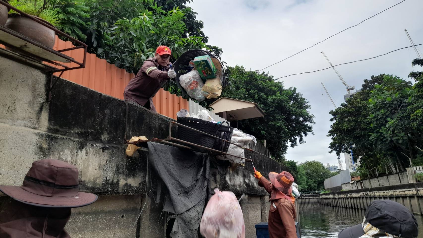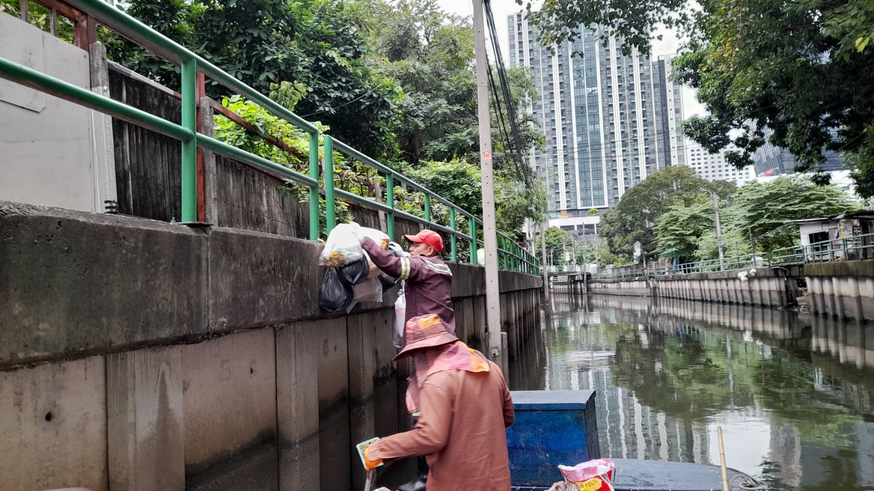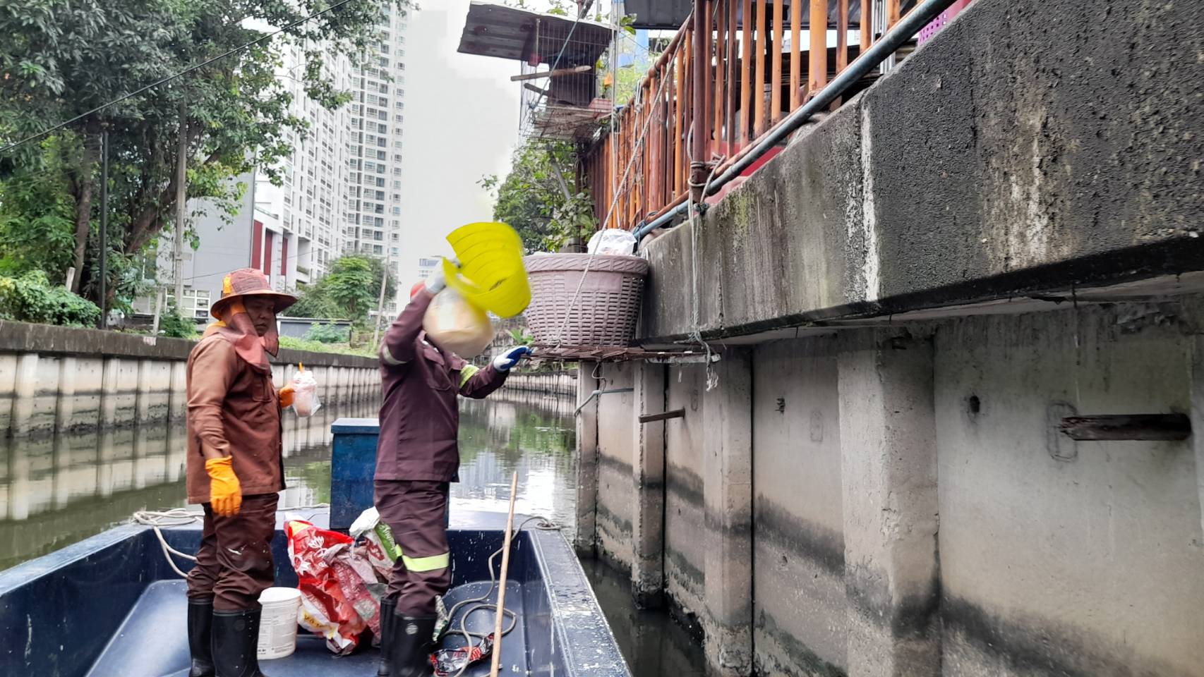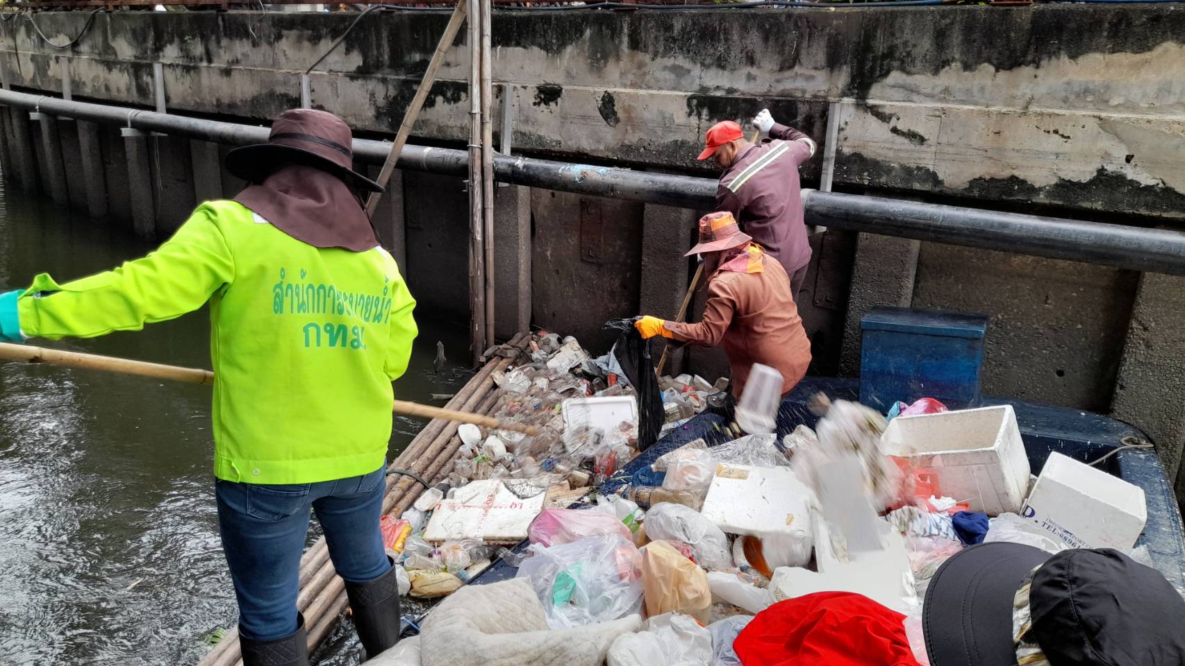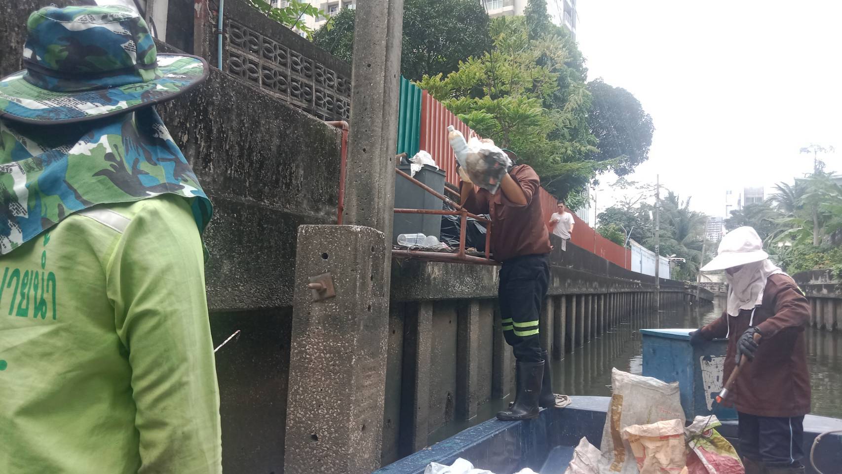 เจ้าหน้าที่ เก็บขยะแนวสันเขื่อนและตักขยะในคลองสามเสน พื้นที่เขตห้วยขวาง เขตดินแดงและเขตราชเทวี