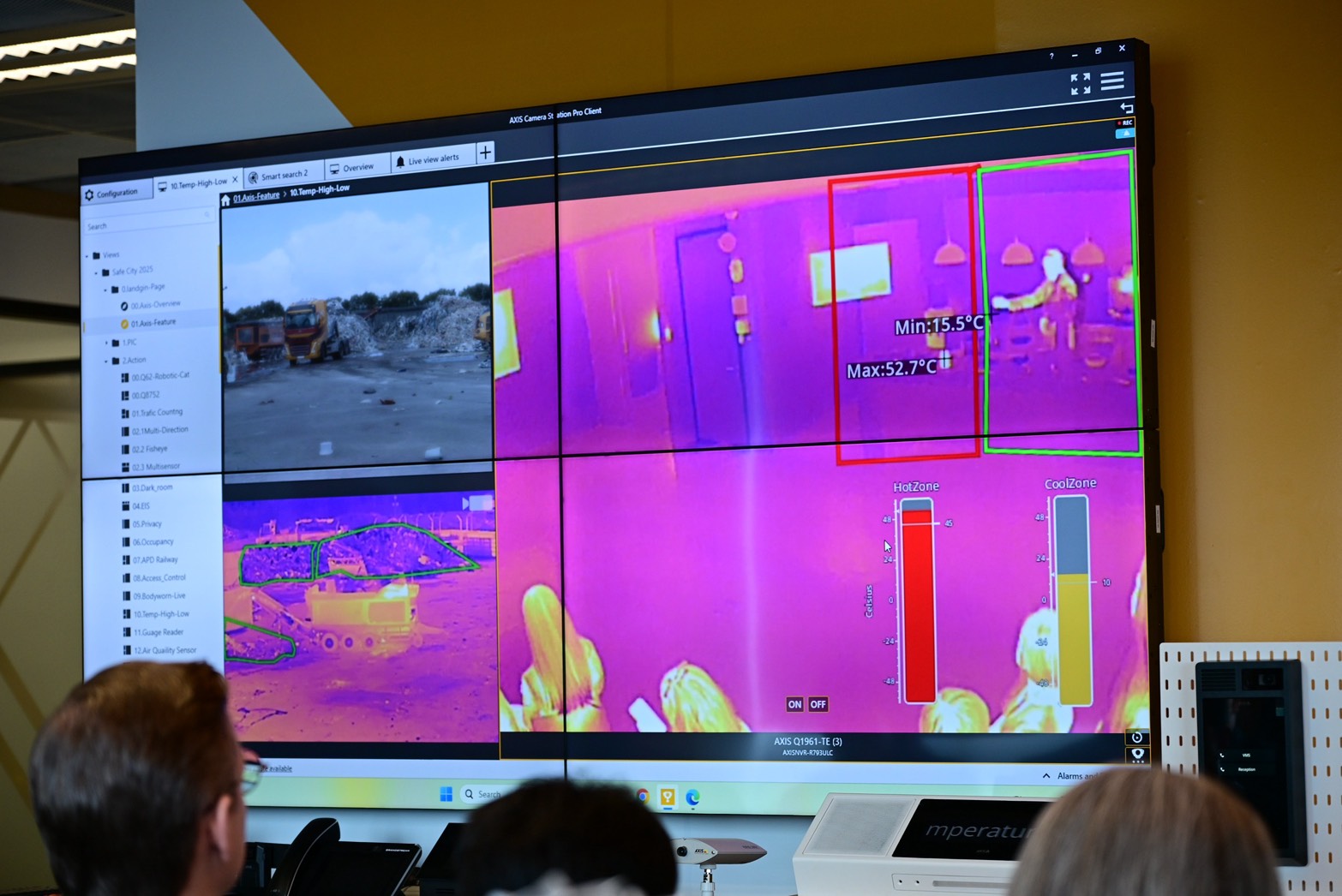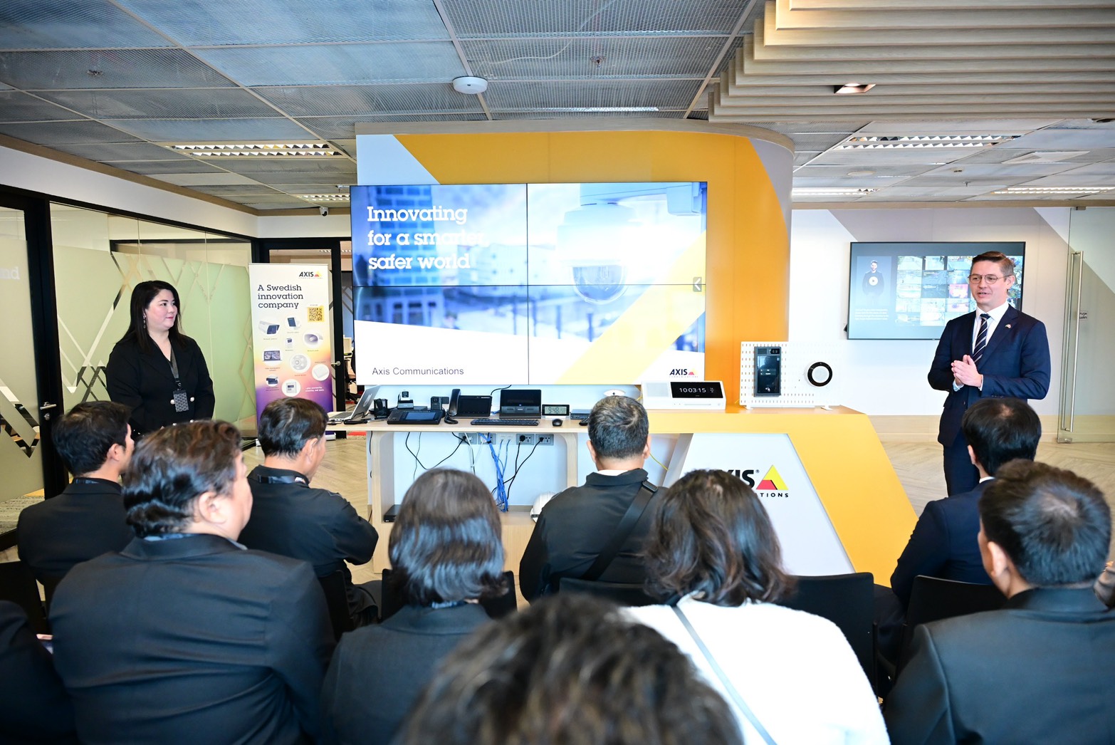 Axis Communications เป็นบริษัทสัญชาติสวีเดน ผู้พัฒนาเครือข่ายกล้องวิดีโอ (ภาพและเสียง) พร้อมให้บริการนวัตกรรมและวิเคราะห์ข้อมูลผ่านเครือข่าย ผ่านระบบแบบ IP-based และใช้เทคโนโลยีปัญญาประดิษฐ์ (AI) เพื่อวิเคราะห์ข้อมูลด้านต่าง ๆ เช่น ด้านการจัดการจราจร ความปลอดภัยสาธารณะ การเฝ้าติดตามสิ่งแวดล้อม การดูแลรักษาความปลอดภัยต่าง ๆ ในการนำเสนอในวันนี้ ได้ทำการจำลองและนำเสนอนวัตกรรมด้านเมืองอัจฉริยะและเมืองปลอดภัยที่จำลองสภาพแวดล้อมเสมือนจริง เพื่อนำเสนอเทคโนโลยีและโซลูชันล่าสุดของบริษัทฯ ให้ผู้เกี่ยวข้องได้ทดสอบการใช้งานเสมือนจริง
