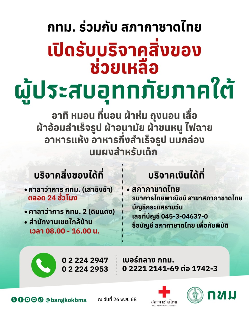 (26 พ.ย. 68) นายณรงค์ เรืองศรี ปลัดกรุงเทพมหานคร เปิดเผยว่า กรุงเทพมหานครร่วมกับสภากาชาดไทย เปิดรับบริจาคสิ่งของจำเป็นเพื่อช่วยเหลือผู้ประสบอุทกภัยภาคใต้ โดยตั้งจุดรับบริจาค 52 จุด ทั่วกรุงเทพฯ จุดหลักที่ศาลาว่าการกรุงเทพมหานคร (เสาชิงช้า) เปิดรับตลอด 24 ชั่วโมง ส่วนจุดรับบริจาคที่ศาลาว่าการกรุงเทพมหานคร 2 (ดินแดง) และที่สำนักงานเขตทั้ง 50 เขต จะเปิดรับบริจาคทุกวัน ตั้งแต่เวลา 08.00 - 16.00 น. ทั้งนี้ สิ่งของที่กรุงเทพมหานครได้รับบริจาคมา จะส่งมอบให้กับสภากาชาดไทยเพื่อนำไปช่วยเหลือผู้ประสบภัยต่อไป
