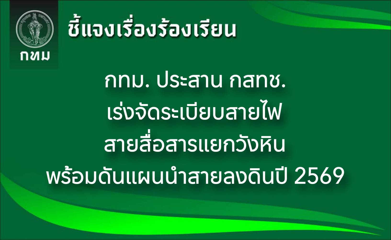 นายประพาส เหลืองศิรินภา ผู้อำนวยการสำนักการโยธา (สนย.) กทม. กล่าวกรณีมีข้อร้องเรียนขอให้จัดระเบียบสายไฟฟ้า สายสัญญาณ และสายสื่อสารบริเวณสี่แยกวังหิน ถนนลาดพร้าว–วังหิน เขตลาดพร้าวว่า งานจัดระเบียบสายสื่อสารอยู่ในความรับผิดชอบของสำนักงานคณะกรรมการกิจการกระจายเสียง กิจการโทรทัศน์ และกิจการโทรคมนาคมแห่งชาติ (กสทช.) และการไฟฟ้านครหลวง (กฟน.) ซึ่งได้กำหนดแผนการนำสายสื่อสารลงดินในช่วงปี 2567–2568 รวม 27 เส้นทาง ระยะทาง 54.60 กิโลเมตร (กม.) พร้อมทั้งแผนจัดระเบียบสายสื่อสาร ในเส้นทางอีก 247 เส้นทาง ระยะทางรวม 460 กม.