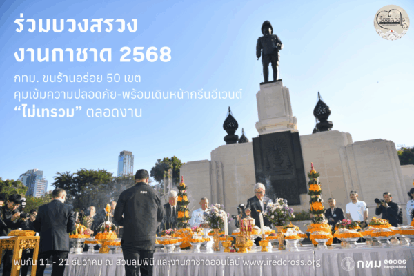 จึงขอเชิญชวนประชาชนร่วมน้อมสำนึกในพระมหากรุณาธิคุณ และร่วมเป็นส่วนหนึ่งในการสืบสานพระราชภารกิจด้านมนุษยธรรม ที่งานกาชาดประจำปี 2568 ณ สวนลุมพินี ตั้งแต่เวลา 11.00 – 22.00 น. และงานกาชาดออนไลน์ www.iredcross.org ตลอด 24 ชั่วโมง