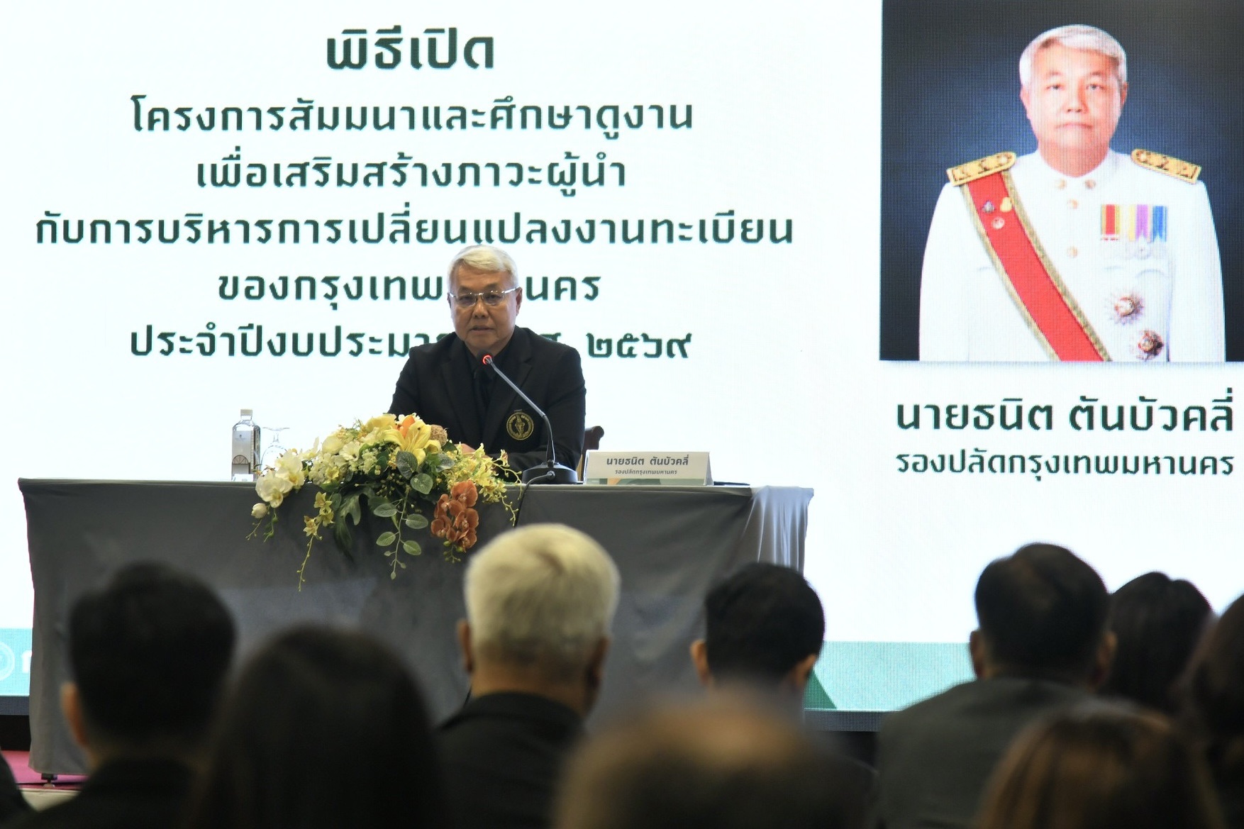(8 ธ.ค. 68) นายธนิต ตันบัวคลี่ รองปลัดกรุงเทพมหานคร เป็นประธานพิธีเปิดโครงการสัมมนาและศึกษาดูงานเพื่อเสริมสร้างภาวะผู้นำ กับการบริหารการเปลี่ยนแปลงงานทะเบียนของกรุงเทพมหานคร ณ ห้องมิ่งเมือง ชั้น 4 โรงแรมเดอะทวิน ทาวเวอร์ เขตปทุมวัน โดยมีนางวรญาณี กลิ่นหอมหวล ผู้อำนวยการสำนักงานปกครองและทะเบียน กล่าวรายงานความเป็นมาของโครงการ