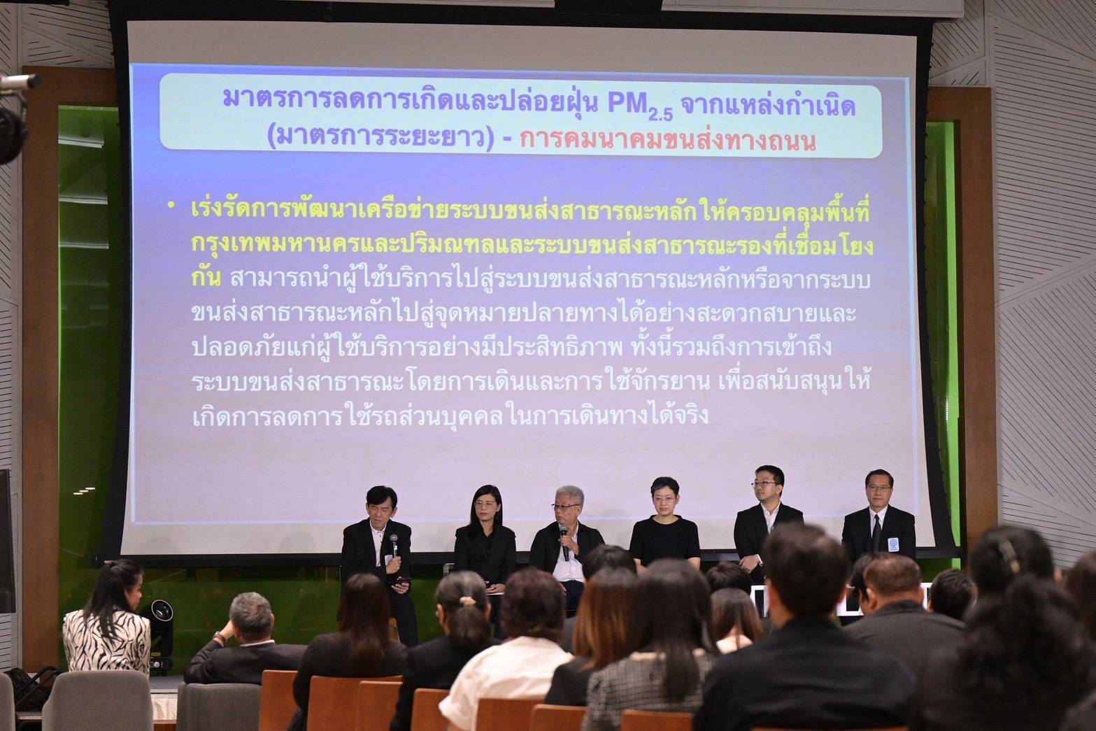 โอกาสนี้ ที่ปรึกษาของผู้ว่าฯ กทม. ได้ร่วมเสวนาหัวข้อ “ทิศทางการจัดการปัญหา PM2.5 ของประเทศไทย” และ “บทบาทของ Thailand National PM2.5 Forum ครั้งที่ 2” นอกจากนี้ นางสาววรนุช สวยค้าข้าว รองผู้อำนวยการสำนักสิ่งแวดล้อม กรุงเทพมหานคร ร่วมเสวนาในเวทีเสวนา Pre PM2.5 Forum : ฝุ่นเมือง ฝุ่นอุตสาหกรรม เรื่องใหญ่ ในหัวข้อ ฝุ่นในภาคเมืองและมาตรการในการบริหารจัดการ รองผู้อำนวยการสำนักสิ่งแวดล้อม ได้พูดถึงสถานการณ์ฝุ่นละออง PM2.5 ในพื้นที่กรุงเทพมหานคร และ 3 สาเหตุหลัก ของการเกิดฝุ่นละอองในพื้นที่กรุงเทพฯ ประกอบด้วย สภาพอากาศปิด การเผาไหม้ของเครื่องยนต์ และการเผาชีวมวล (การเผาไหม้การเกษตร) รวมถึง การยกระดับ 10 มาตรการ เมื่อกรุงเทพฯ มีระดับฝุ่นสูง เกินมาตรฐาน ส่งผลกระทบต่อสุขภาพของประชาชน ได้แก่ 1. โครงการ Green List Plus รถคันนี้ลดฝุ่น ส่งเสริมให้ประชาชนเปลี่ยนน้ำมันเครื่องและไส้กรองอากาศ เพื่อลดการปล่อยมลพิษจากแหล่งกำเนิด และลงทะเบียน Green List Plus เพื่อรับสิทธิประโยชน์ต่าง ๆ 2. ยกระดับมาตรการเขตมลพิษต่ำ (Low Emission Zone : LEZ) ครอบคลุมทั่วกรุงเทพฯ 50 เขต 3. ยกระดับมาตรฐานการจัดการรถยนต์ควันดำห้ามเกิน 20% จากเดิมห้ามเกิน 30% เพื่อลดการปล่อยมลพิษจากแหล่งกำเนิด 4. ยกระดับการตรวจรถในไซต์ก่อสร้าง/สถานประกอบการ เพื่อลดการปล่อยมลพิษจากแหล่งกำเนิด 5. ยกระดับการจัดการมลพิษในโรงงาน 6. ยกระดับการประสานงาน และสนับสนุนจังหวัดข้างเคียง ในการทำข้อตกลงร่วมกันเพื่อสนับสนุนการลดการเผาชีวมวล (การเผาไหม้การเกษตร) 7. การมีส่วนร่วมของประชาชน ยกระดับการแจ้งเตือน โดยแจ้งเตือนผ่าน Social Media ทั้งเว็บไซต์และแอปพลิเคชัน AirBKK พร้อมเพิ่มช่องทาง Cell Broadcast และระบบพยากรณ์คาดการณ์ฝุ่นรายเขตเรียลไทม์ เพิ่มเป็น 7 วัน จากเดิม 3 วัน โดยมีการแจ้งเตือนค่าฝุ่นในเชิงพื้นที่ และแนะนำวิธีการดูแลตนเองในช่วงที่ค่าฝุ่นสูง มีการสื่อสารเป็นภาษาอังกฤษให้กับนักท่องเที่ยวและชาวต่างชาติที่อยู่ในพื้นที่กรุงเทพฯ ด้วย นอกจากนี้ เปิดโอกาสให้ประชาชนมีส่วนร่วมโดยสามารถแจ้งเหตุหรือแหล่งกำเนิดฝุ่นได้ทาง Traffy Fondue 8.การจัดทำห้องปลอดฝุ่น ในโรงเรียน กทม. และศูนย์พัฒนาเด็กเล็ก ให้ครอบคลุม 9. ยกระดับมาตรการ Work From Home: WFH เป็นอีกมาตรการหนึ่งที่ภาครัฐ เอกชน และประชาชน จะมีส่วนร่วมลดปัญหาฝุ่นการจราจร โดยลดการเดินทาง ดูแลสุขภาพตัวเอง และลดผลกระทบต่อสุขภาพ โดยปี 2569 ตั้งเป้าเข้าร่วมสูงสุด 300,000 คน และ10. เพิ่มพื้นที่สีเขียว ด้วยการปลูกต้นไม้ล้านต้น เพิ่มเป้าหมายเป็น 3 ล้านต้น จากตอนนี้ปลูกไปแล้วกว่า 2.2 ล้านต้น และเพิ่มสวน 15 นาที ให้ครบ 500 แห่ง ตามเป้าหมาย ปัจจุบ