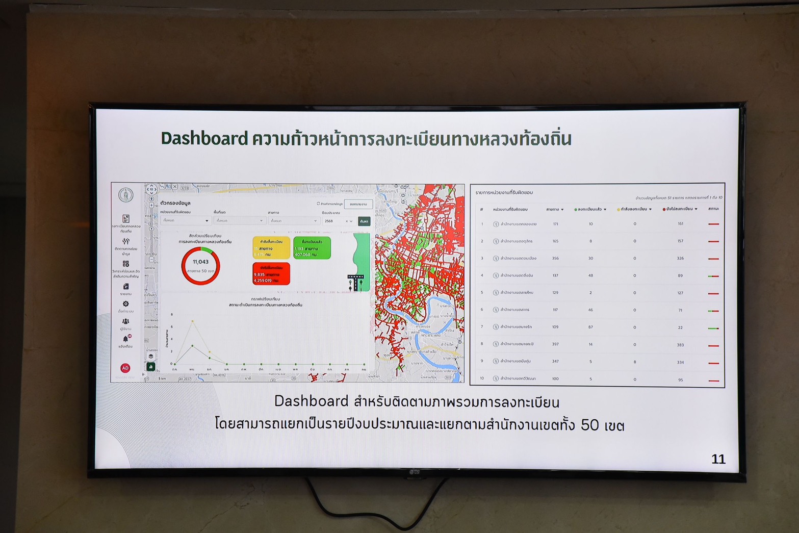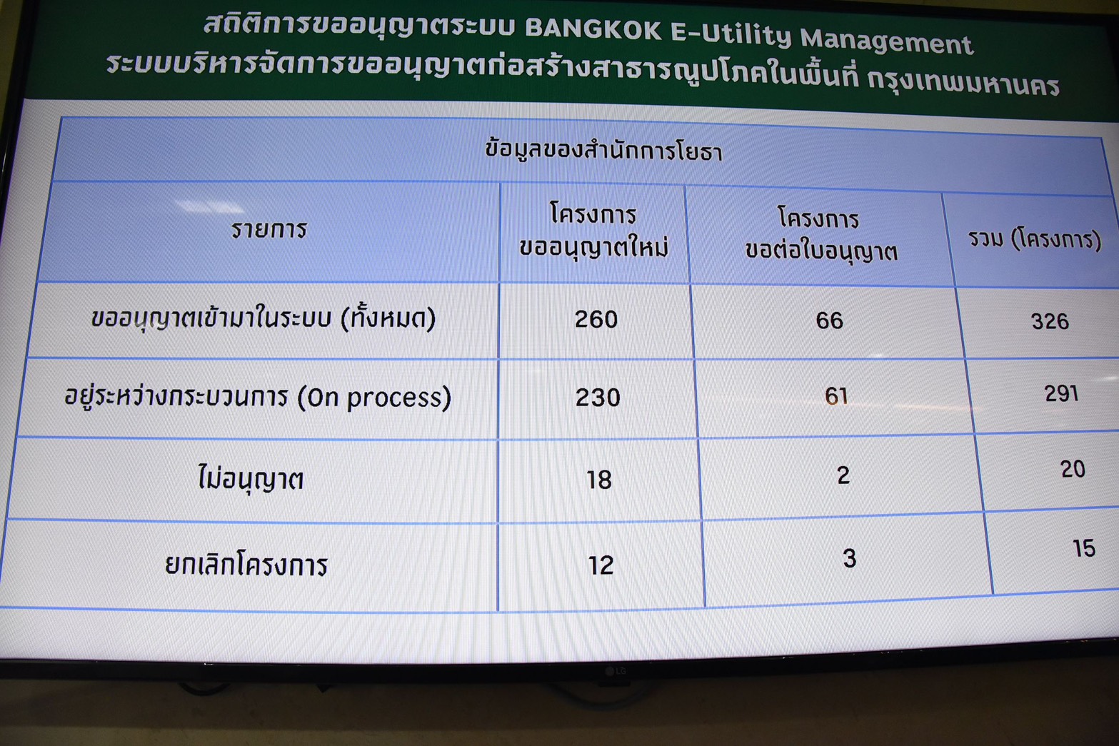 ที่ประชุมรายงานการขึ้นทะเบียนทางหลวงท้องถิ่น รวม 6,628 จุด สำนักการโยธา ประกาศแล้ว 374 จุด ยังไม่ประกาศ 11 จุด เป็นของหน่วยงานอื่น 33 จุด สำนักงานเขต ประกาศแล้ว 2,615 จุด ยังไม่ประกาศ 3,595 จุด ด้านการยื่นขออนุญาตก่อสร้างสาธารณูปโภคออนไลน์ผ่านระบบ BANGKOK E-Utility Management มีสถิติการขออนุญาตเข้ามาในระบบ รวมทั้งสิ้น 326 โครงการ เป็นการขออนุญาตใหม่ 260 โครงการ ขอต่อใบอนุญาต 66 โครงการ โดยอยู่ระหว่างดำเนินการ 291 โครงการ ไม่อนุญาต 20 โครงการ และยกเลิกโครงการ 15 โครงการ สำหรับโครงการที่อยู่ระหว่างดำเนินการแบ่งเป็นโครงการปกติ 192 โครงการ และโครงการฉุกเฉิน 29 โครงการ