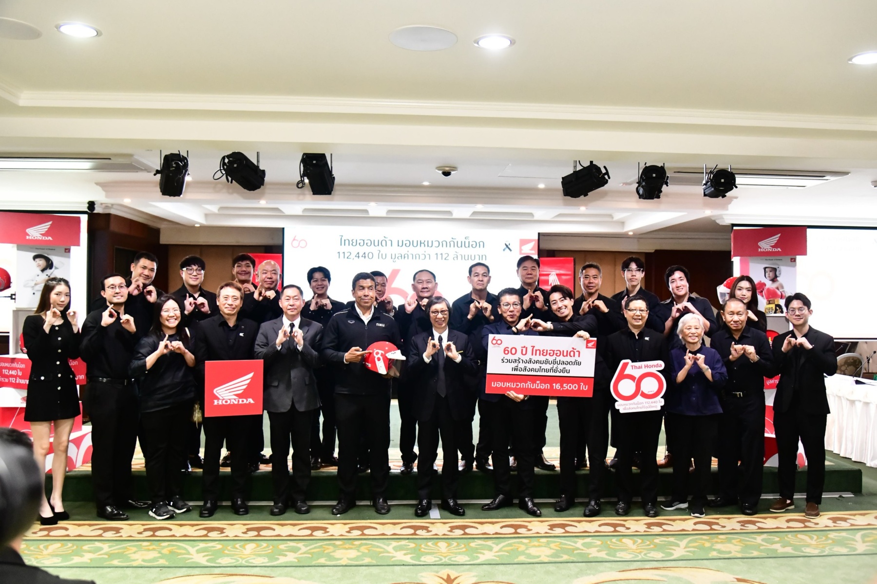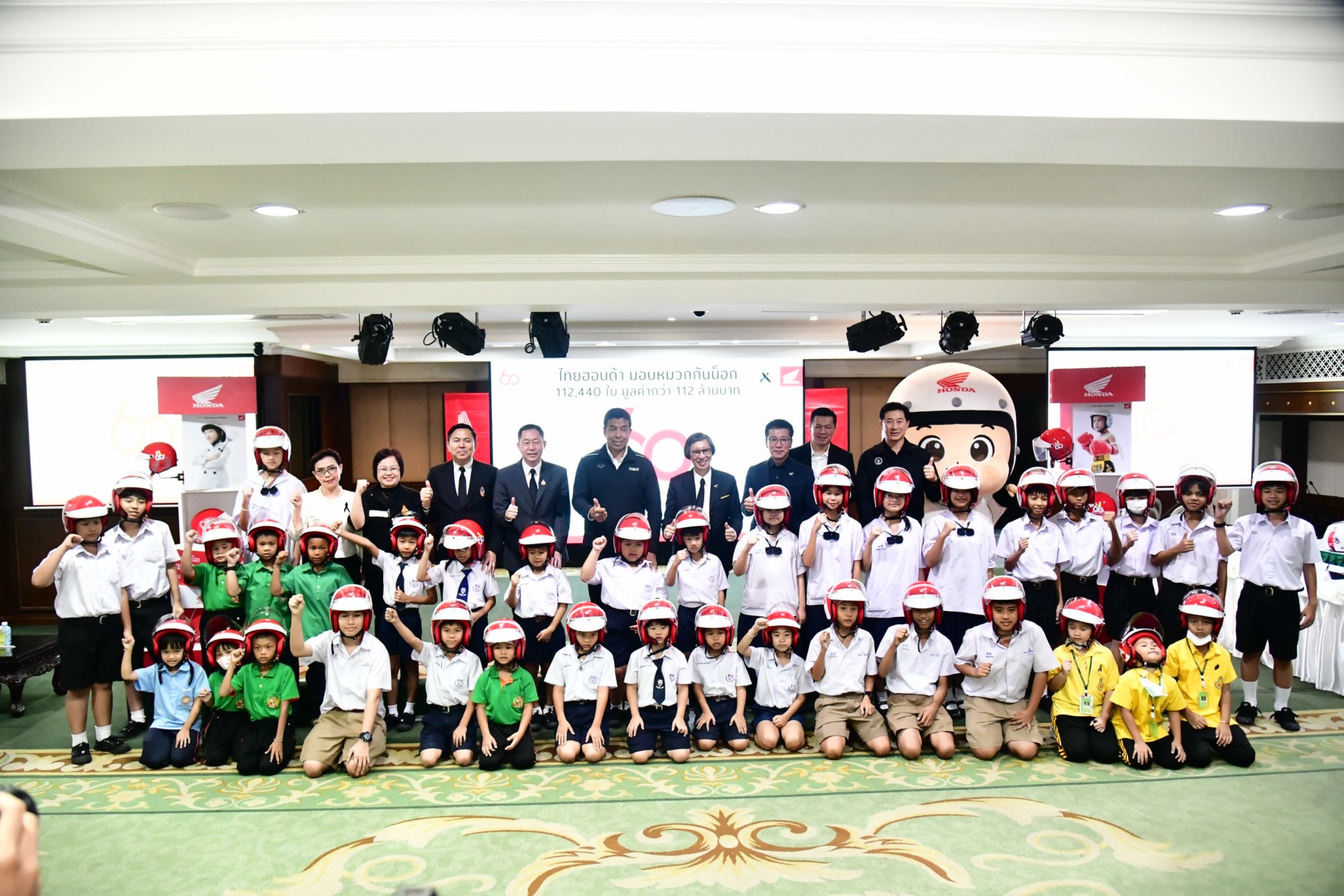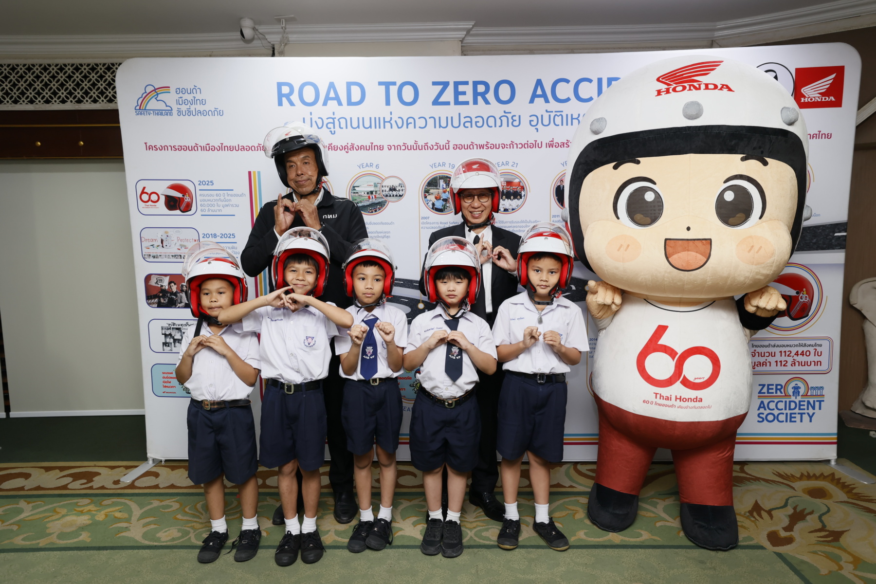 สำหรับโครงการ “60 ปี ไทยฮอนด้า ขับขี่ปลอดภัย เพื่อสังคมไทยที่ยั่งยืน” มีวัตถุประสงค์เพื่อส่งเสริมวัฒนธรรมการขับขี่ปลอดภัยและการสวมหมวกกันน็อก โดยเฉพาะในกลุ่มเด็กและเยาวชน รวมถึงเป็นการเติมเต็มความต้องการหมวกกันน็อกที่ยังขาดแคลนสำหรับเด็กนักเรียน โดยไทยฮอนด้าได้ส่งมอบหมวกกันน็อกจำนวน 16,500 ใบ มูลค่ารวมกว่า 16.5 ล้านบาท ให้แก่กรุงเทพมหานคร เพื่อส่งมอบให้กับสำนักงานเขต สถานศึกษาในสังกัดกรุงเทพมหานคร กรมป้องกันและบรรเทาสาธารณภัย สำนักงานคณะกรรมการการอาชีวศึกษา และสำนักงานคณะกรรมการการศึกษาขั้นพื้นฐาน