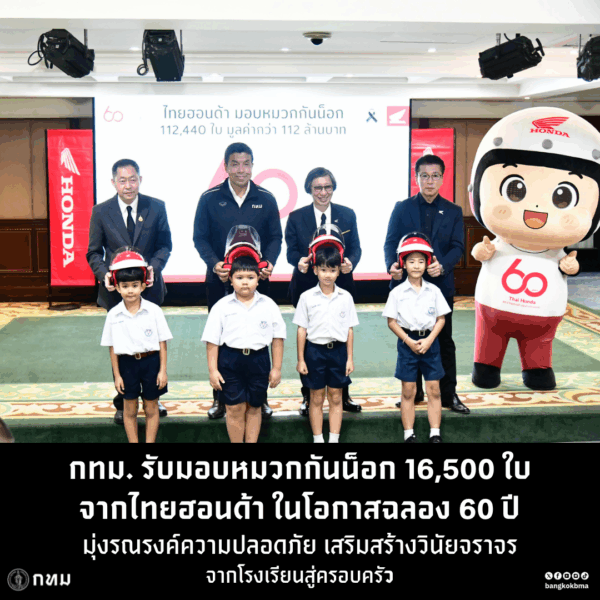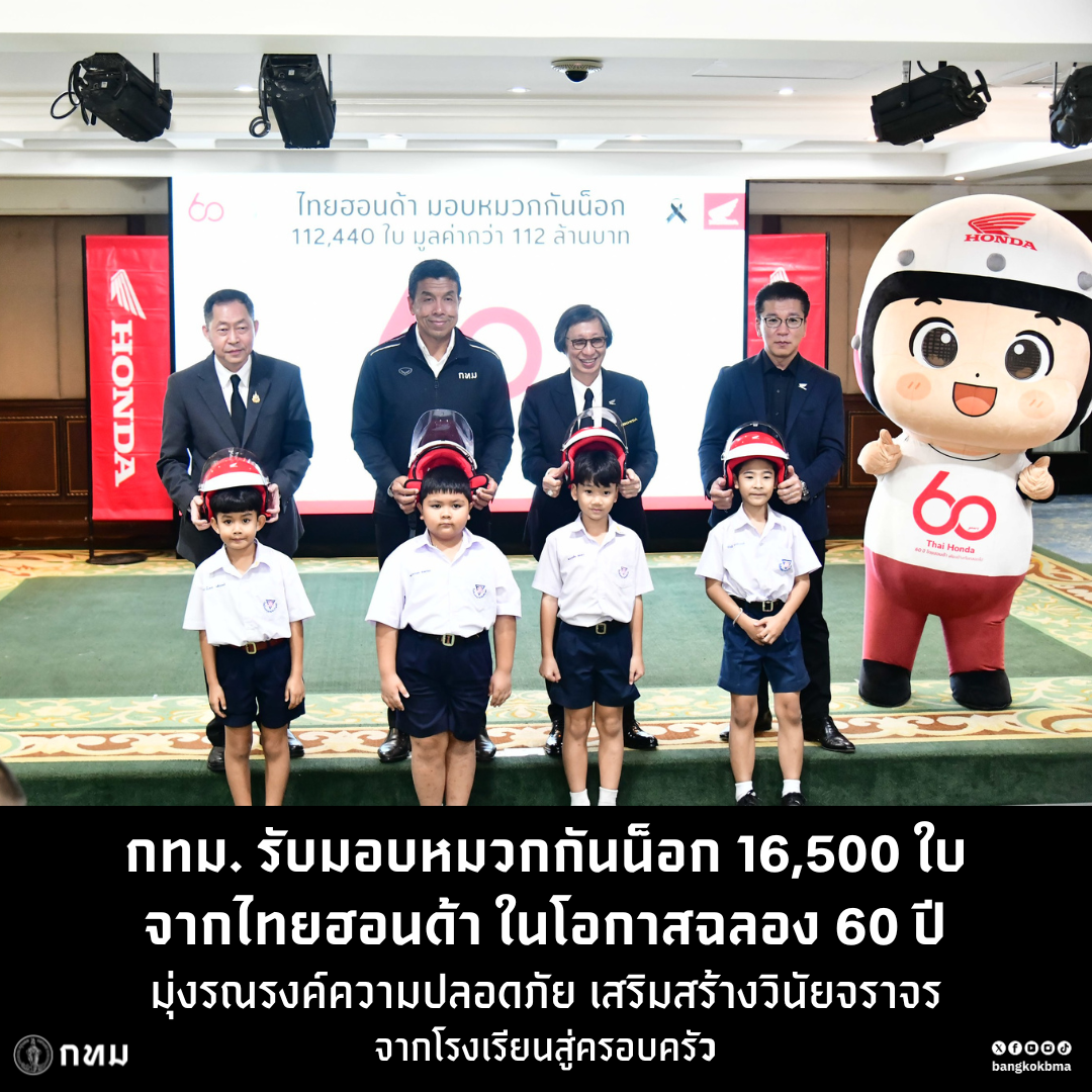 (17 ธ.ค. 68) นายชัชชาติ สิทธิพันธุ์ ผู้ว่าราชการกรุงเทพมหานคร เป็นประธานในพิธีรับมอบหมวกกันน็อกจาก ดร.อารักษ์ พรประภา ประธานบริษัท ไทยฮอนด้า จำกัด และคุณฮายาโตะ เซกุจิ รองประธานกรรมการบริหารบริษัท ไทยฮอนด้า จำกัด ภายใต้โครงการ “60 ปี ไทยฮอนด้า ขับขี่ปลอดภัย เพื่อสังคมไทยที่ยั่งยืน” ซึ่งจัดขึ้นที่กรุงเทพมหานคร โดยเป็นจังหวัดสุดท้ายของภารกิจการส่งมอบหมวกกันน็อกทั่วประเทศ