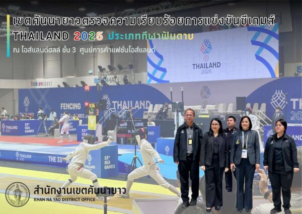 (17 ธ.ค. 68) เวลา 10.30 น. นางสาวกัลยา บุญแดง ผู้อำนวยการเขตคันนายาว พร้อมด้วยนางชอ้อน วีระสุนทร ผู้ช่วยผู้อำนวยการเขต หัวหน้าฝ่ายสิ่งแวดล้อมฯ หัวหน้าฝ่ายพัฒนาชุมชนฯ เจ้าหน้าที่ผู้เกี่ยวข้อง เข้าร่วมชมและเชียร์ให้กำลังใจนักกีฬาไทยในการแข่งขันกีฬาฟันดาบโอกาสนี้ ได้ตรวจเยี่ยมกองอำนวยการร่วม รวมทั้งดูแลความเรียบร้อยบริเวณพื้นที่จัดการแข่งขันกีฬาซีเกมส์ ครั้งที่ 33 Thailand 2025 ณ ไอส์แลนด์ ฮอลล์ ชั้น 3 ศูนย์การค้าแฟชั่นไอส์แลนด์ ถนนรามอินทรา เขตคันนายาว กรุงเทพมหานคร