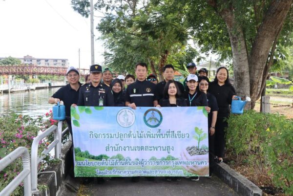 นายพงศธร ชั้นไพศาลศิลป์ ผู้อำนวยการเขตสะพานสูง นางพิชญสินี ปานเกตุ ผู้ช่วยผู้อำนวยการเขตสะพานสูง พร้อมคณะผู้บริหารเขต และเจ้าหน้าที่ฝ่ายรักษาความสะอาดฯ ลงพื้นที่ปลูกต้นไม้ จำนวน 105 ต้น เพื่อเพิ่มพื้นที่สีเขียว บริเวณพื้นที่สาธารณะริมคลองแสนแสบ ตามนโยบาย “ปลูกต้นไม้ล้านต้น เพิ่มพื้นที่สีเขียว เป็นกำแพงกรองฝุ่นทั่วกรุง“ ของผู้ว่าราชการกรุงเทพมหานคร