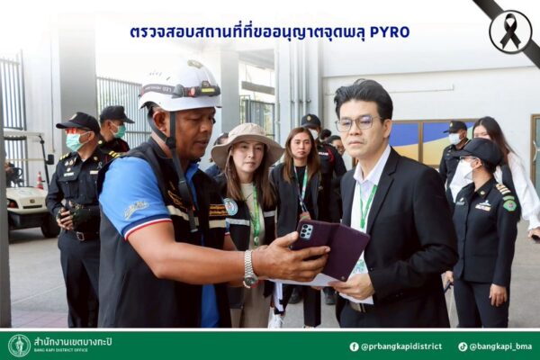 24 ธันวาคม 2568 นางสิริกาญจน์ สุยวณิชย์ ผู้อำนวยการเขตบางกะปิ มอบหมายให้ นายสิริพงศ์ แจ้งรัศมีกาล ผู้ช่วยผู้อำนวยการเขตบางกะปิ นายภาศกร วชิรเมษฐ์ หัวหน้าฝ่ายเทศกิจ และเจ้าหน้าที่ที่เกี่ยวข้อง ลงพื้นที่ตรวจสอบสถานที่ที่ขออนุญาตจุดพลุ PYRO ณ สนามราชมังคลากีฬาสถาน การกีฬาแห่งประเทศไทย เขตบางกะปิ เพื่อตรวจสอบมาตรการที่เกี่ยวข้องตามข้อบัญญัติกรุงเทพมหานคร เรื่อง มาตรการป้องกันและแก้ไขปัญหาความเดือดร้อนจากการจุดและปล่อยบั้งไฟ พลุ ตะไล โคมลอย โคมควัน หรือวัตถุอื่นใดที่คล้ายคลึงกัน พ.ศ. 2561 และประกาศกรุงเทพมหานคร เรื่อง การขอรับใบอนุญาต การอนุญาต และแผนการป้องกันเหตุอันตรายที่อาจจะเกิดขึ้นจากการจุดและปล่อย หรือกระทำการอย่างใด เพื่อให้บั้งไฟ พลุ ตะไล โคมลอย โคมควัน หรือวัตถุอื่นใดที่คล้ายคลึงกันขึ้นไปสู่อากาศ