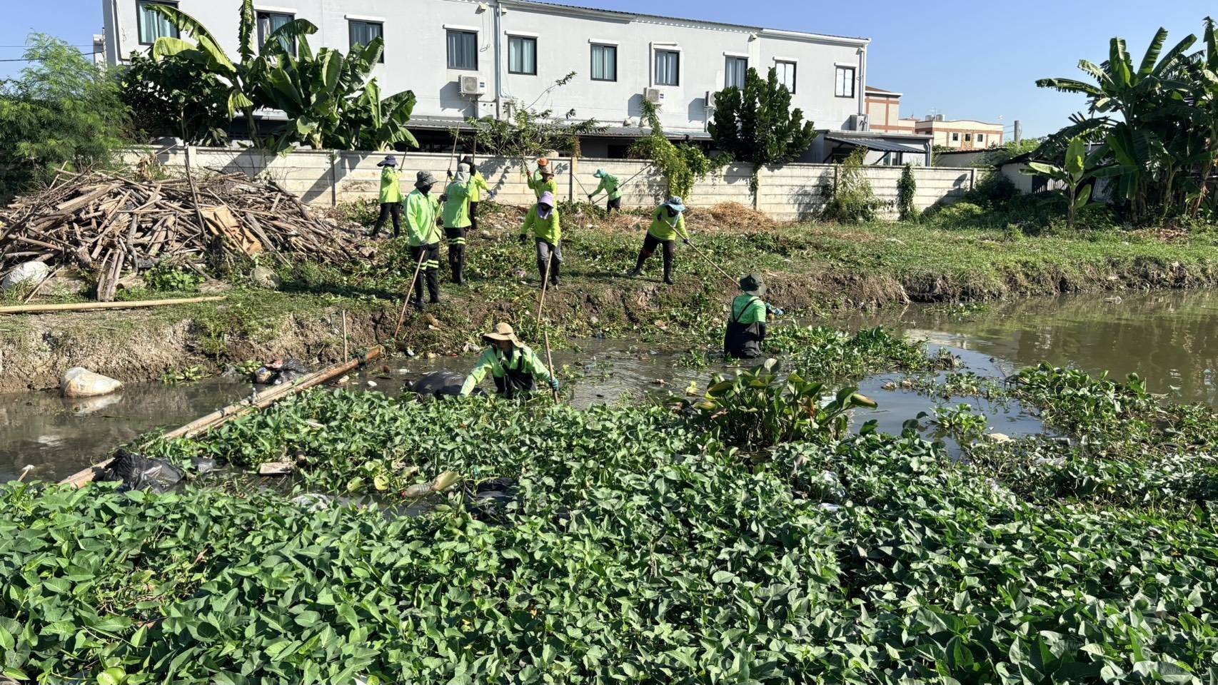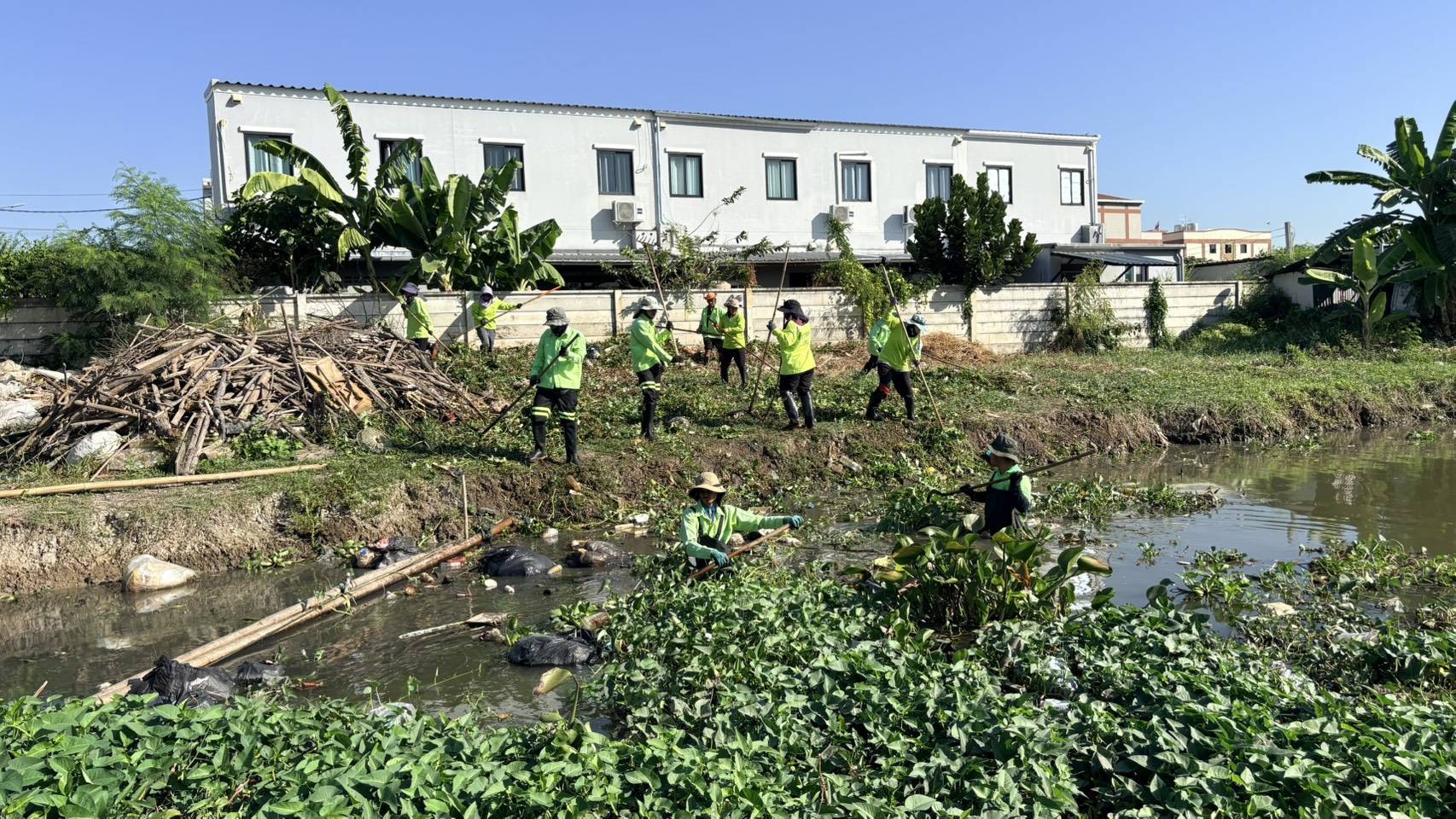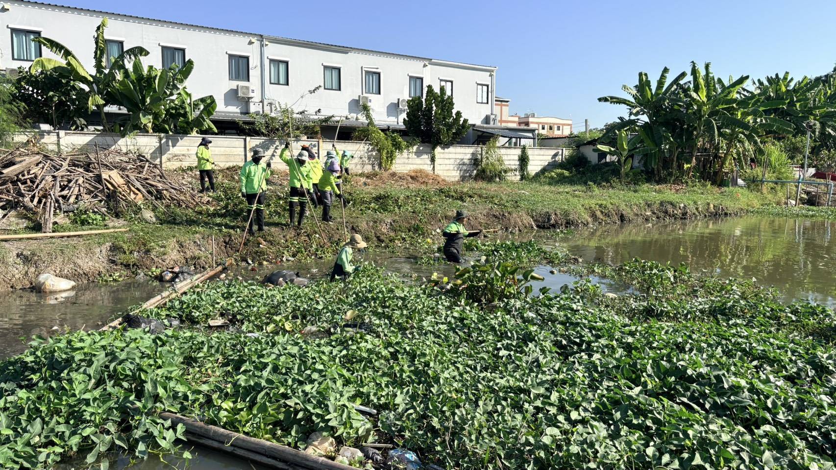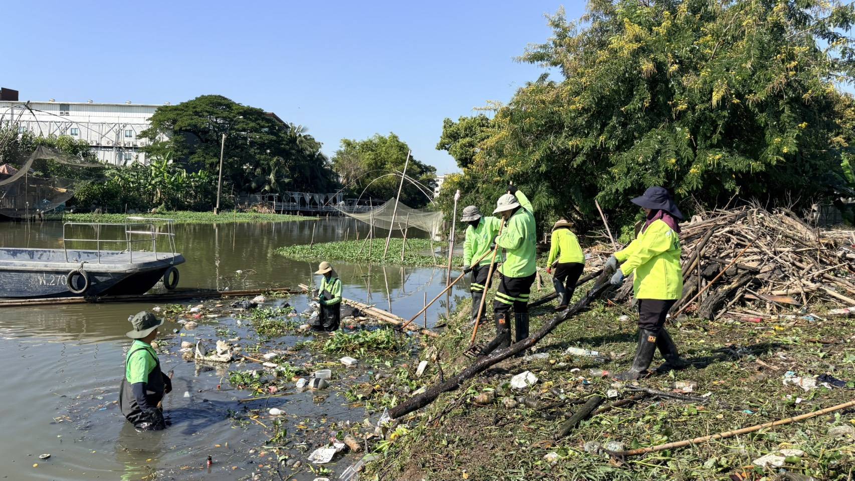 เจ้าหน้าที่ เก็บขยะวัชพืชคลองประเวศบุรีรมย์ช่วงแพวัดสังฆราชา พื้นที่เขตลาดกระบัง