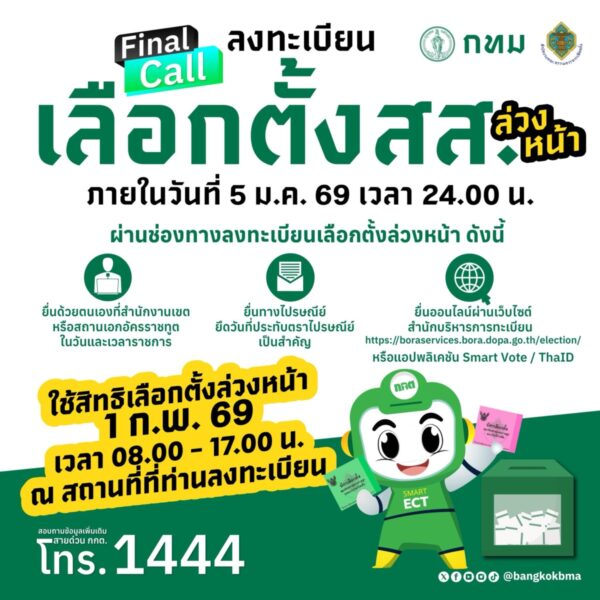 >>> ใครไม่สะดวกไปเลือกตั้งวันจริง (8 ก.พ.69) ทั้ง ในเขต / นอกเขต / นอกราชอาณาจักร รีบลงทะเบียนก่อนระบบปิด