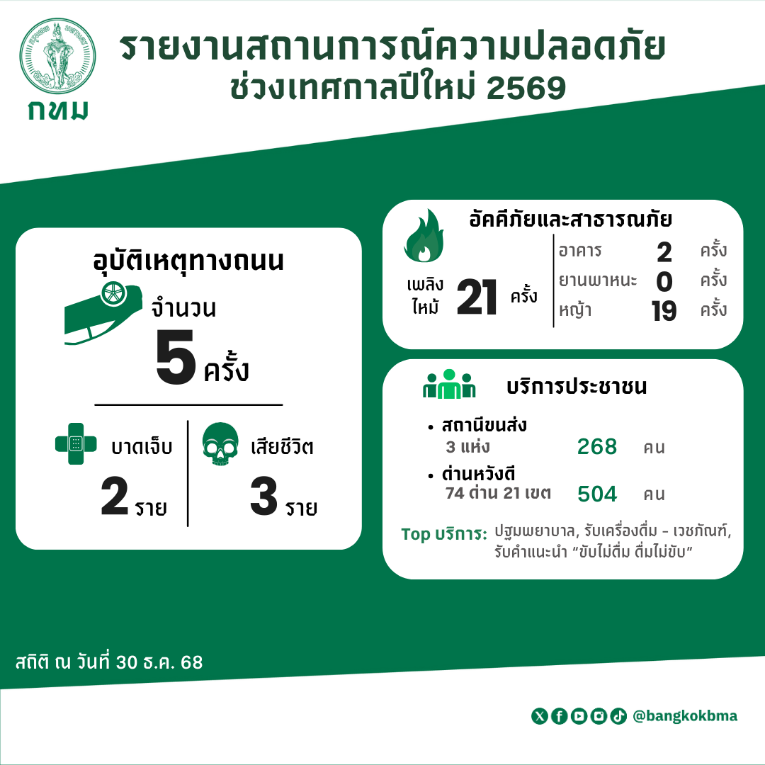 จากการรายงานของหน่วยงานต่าง ๆ ในที่ประชุม พบว่า เมื่อวันที่ 30 ธ.ค. 68 ที่ผ่านมา ในพื้นที่กรุงเทพฯ มีเหตุเพลิงไหม้อาคาร 2 ครั้ง ไม่มีผู้ได้รับบาดเจ็บหรือเสียชีวิต ด้านอุบัติเหตุทางถนน มีอุบัติเหตุ 5 ครั้ง พบผู้บาดเจ็บ 2 ราย เสียชีวิต 3 ราย (ชาย 2 ราย หญิง 1 ราย) ผู้เสียชีวิตทั้งหมดเป็นผู้ขับขี่รถจักรยานยนต์ (สวมหมวกนิรภัย 1 ราย ไม่สวมหมวกนิรภัย 2 ราย) ขณะที่ด้านบริการประชาชน มีผู้รับบริการที่หน่วยปฐมพยาบาล ณ สถานีขนส่ง 3 แห่ง ได้แก่ สถานีขนส่งสายใต้ใหม่ เขตตลิ่งชัน สถานีขนส่งเอกมัย เขตคลองเตย และสถานีขนส่งหมอชิต เขตจตุจักร รวม 268 ราย มีผู้รับบริการที่ “ด่านหวังดี ขับไม่ดื่ม ดื่มไม่ขับ เทศกาลปีใหม่ 2569” ทั้ง 74 ด่าน ในพื้นที่ 21 เขต รวม 504 ราย ซึ่งเน้นกิจกรรมการรณรงค์ขับไม่ดื่ม บริการเครื่องดื่มและเวชภัณฑ์ รวมถึงการประเมินอาการมึนเมาเบื้องต้น