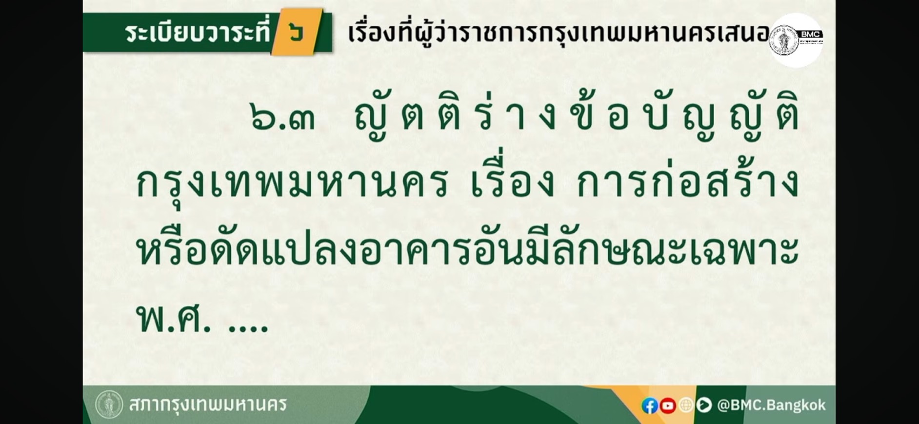 (7 ม.ค. 69) นายชัชชาติ สิทธิพันธุ์ ผู้ว่าราชการกรุงเทพมหานคร ได้เสนอร่างข้อบัญญัติ กรุงเทพมหานคร เรื่อง การก่อสร้าง หรือดัดแปลงอาคารอันมีลักษณะเฉพาะ พ.ศ. … ในการประชุมสภากรุงเทพมหานคร สมัยประชุมสามัญ สมัยแรก (ครั้งที่ 1) ประจำปี พ.ศ. 2569 โดยมีนายฉัตรชัย หมอดี รองประธานสภากรุงเทพมหานคร คนที่ 2 เป็นประธานการประชุม ณ ห้องประชุมสภากรุงเทพมหานคร อาคารไอราวัตพัฒนา ศาลาว่าการกรุงเทพมหานคร 2 (ดินแดง)