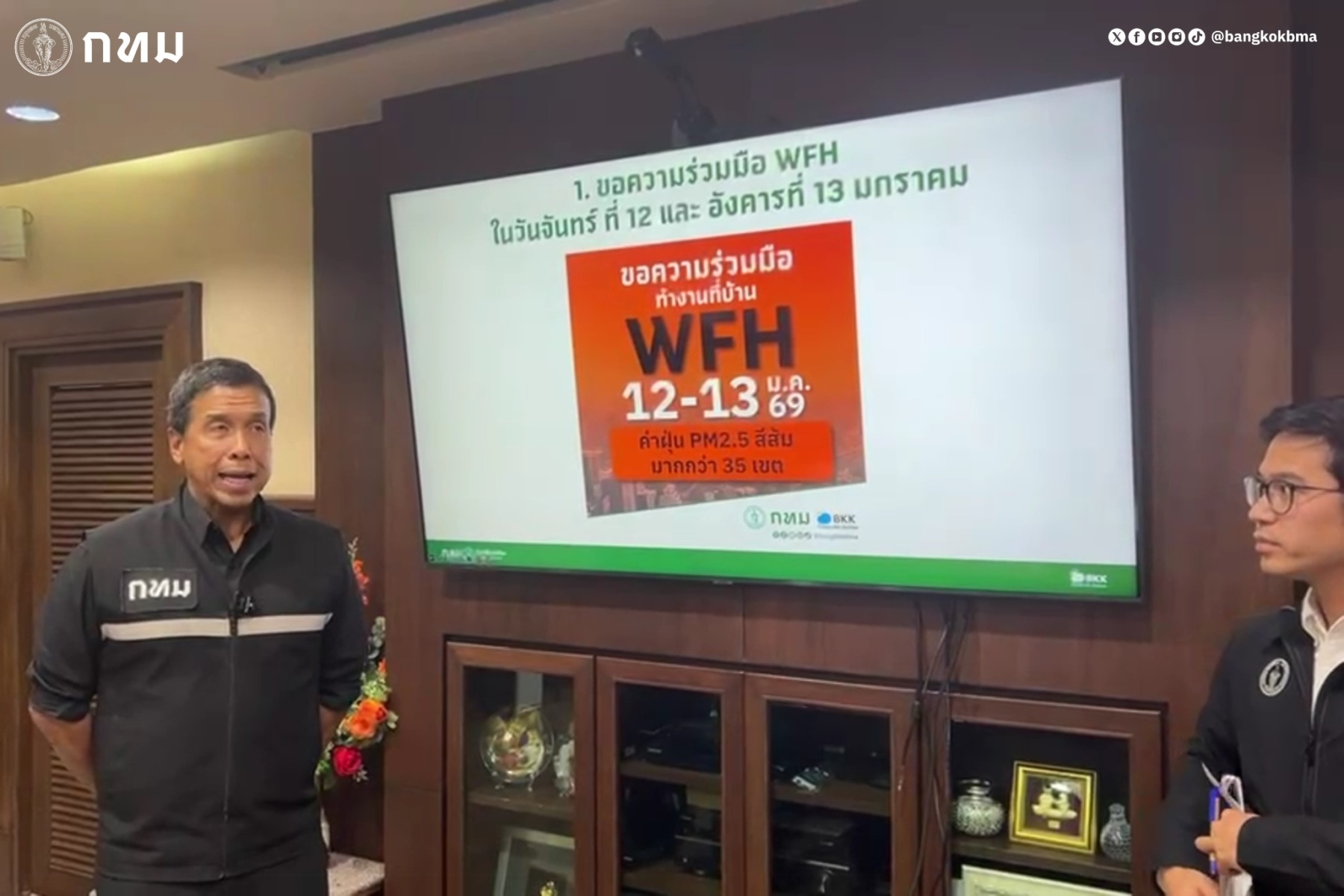 (9 ม.ค. 69) เวลา 16.30 น. ณ ห้องอัมรินทร์ ศาลาว่าการกรุงเทพมหานคร (เสาชิงช้า) เขตพระนคร นายชัชชาติ สิทธิพันธุ์ ผู้ว่าราชการกรุงเทพมหานคร เปิดเผยว่า กรุงเทพมหานครขอความร่วมมือหน่วยงานภาครัฐ ภาคเอกชน และสถานประกอบการต่าง ๆ ให้บุคลากรสามารถปฏิบัติงานที่บ้าน (Work From Home : WFH) ในวันจันทร์ที่ 12 และวันอังคารที่ 13 มกราคม 2569 เพื่อลดปริมาณการจราจรและการปล่อยมลพิษทางอากาศจากยานพาหนะ หลังจากมีการคาดการณ์ว่าสถานการณ์ฝุ่นละอองขนาดเล็ก PM2.5 ในพื้นที่กรุงเทพมหานครและปริมณฑลจะเข้าสู่ช่วงวิกฤต เนื่องจากสภาพอากาศปิดและการระบายอากาศต่ำ