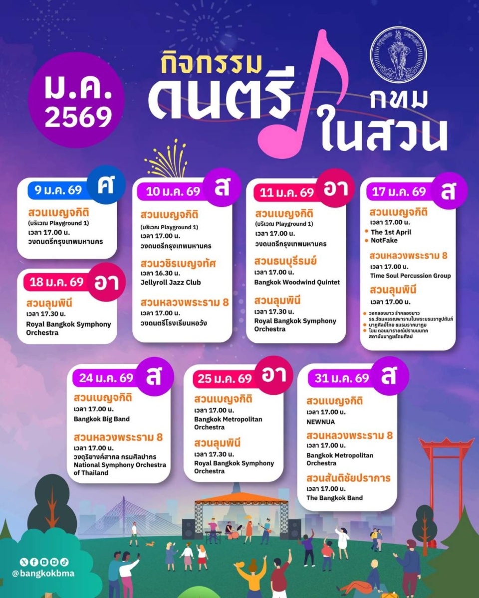 ทั้งนี้ ในช่วงที่คุณภาพอากาศดี กรุงเทพมหานครขอเชิญชวนประชาชนร่วมพักผ่อนและเติมความสุขกับกิจกรรม “ดนตรีในสวน” ประจำเดือนมกราคม 2569 เพลิดเพลินกับการแสดงดนตรีหลากหลายแนวจากศิลปินและวงดนตรีคุณภาพ ในบรรยากาศสวนสาธารณะทั่วกรุงเทพมหานคร เปิดให้เข้าชมฟรี โดยสามารถติดตามตารางการแสดง วัน เวลา และสถานที่ ได้ทางเพจ สำนักวัฒนธรรม กีฬา และการท่องเที่ยว และ กรุงเทพมหานคร