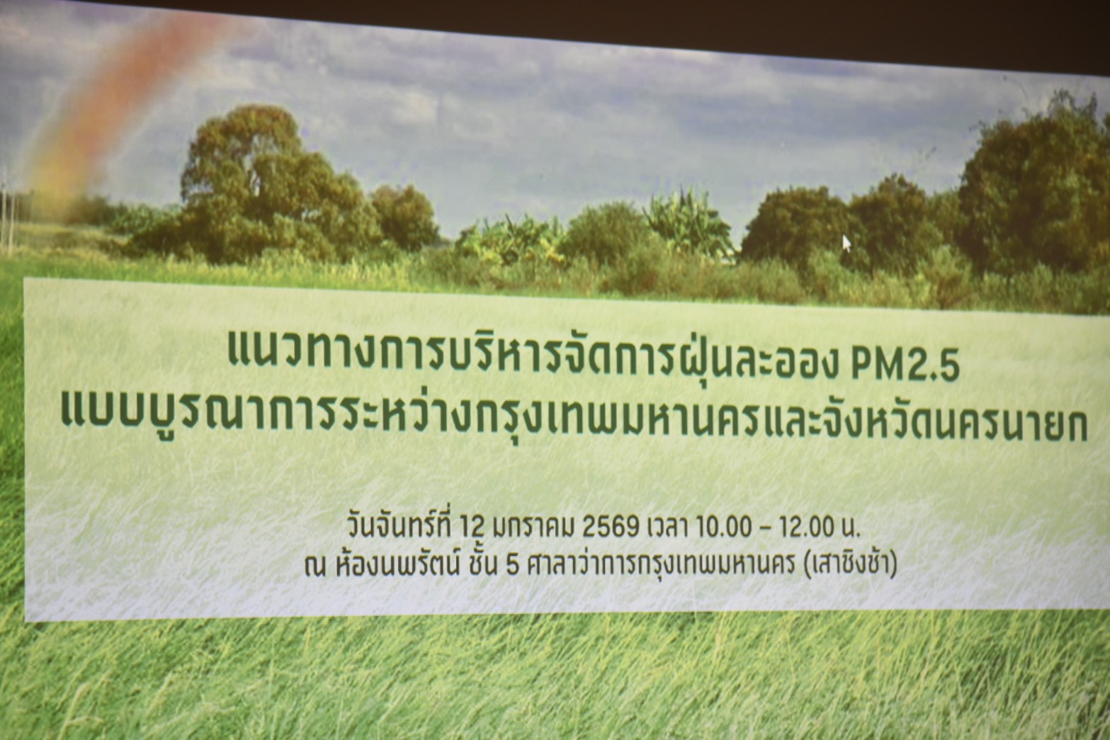 (12 ม.ค. 69) นายชัชชาติ สิทธิพันธุ์ ผู้ว่าราชการกรุงเทพมหานคร พร้อมด้วยนายชานน วาสิกศิริ ผู้ว่าราชการจังหวัดนครนายกร่วมประชุมแนวทางการบริหารจัดการฝุ่นละออง PM2.5 แบบบูรณาการและความร่วมมือข้ามจังหวัดระหว่างกรุงเทพมหานครและจังหวัดนครนายก ณ ห้องนพรัตน์ ชั้น 5 ศาลาว่าการกรุงเทพมหานคร (เสาชิงช้า) เขตพระนคร