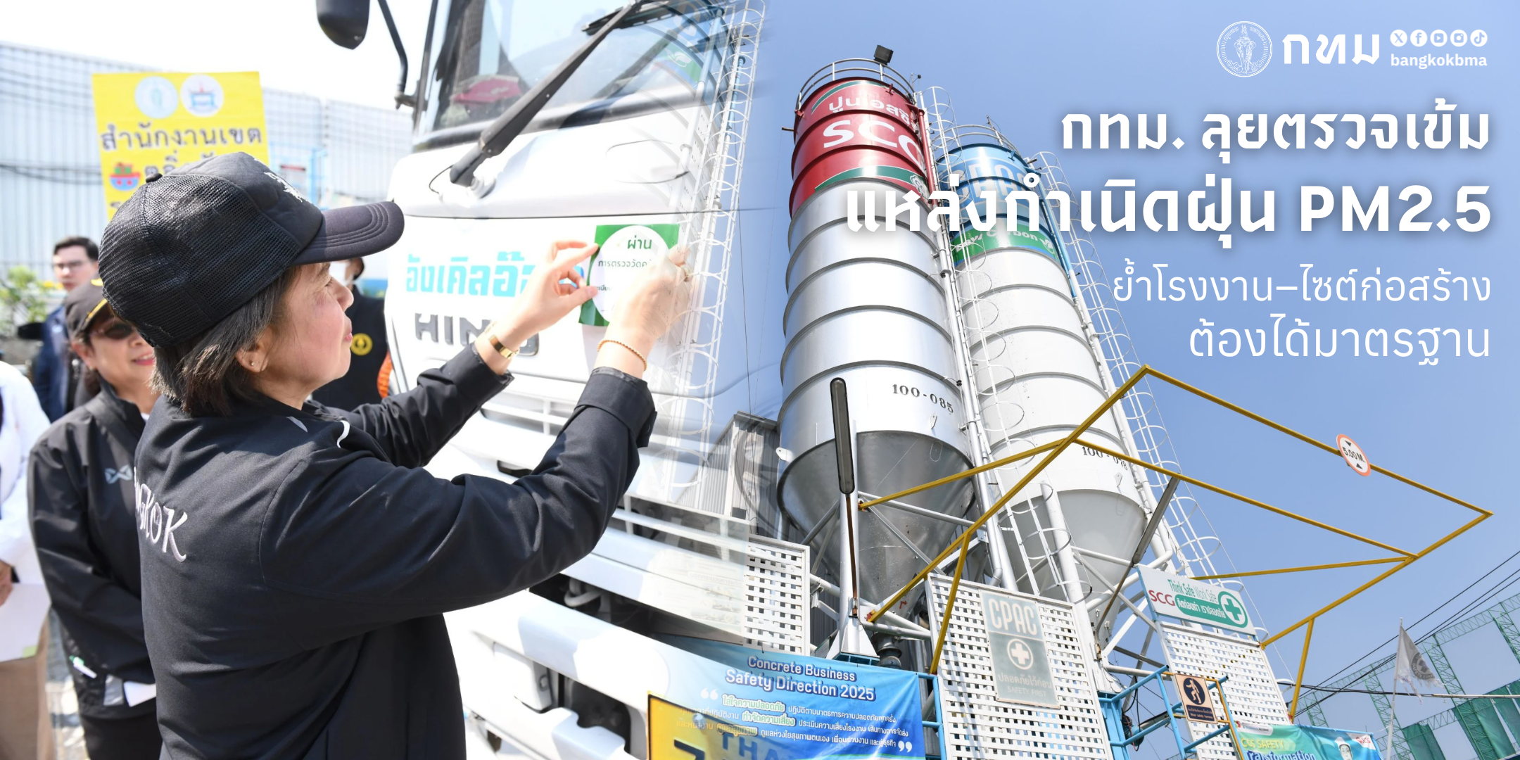 (13 ม.ค. 69) เวลา 13.00 น. นางสาวกนกวรรณ เอี่ยมลิ้ม รองปลัดกรุงเทพมหานคร ลงพื้นที่ติดตามมาตรการป้องกันและแก้ไขปัญหาฝุ่น PM2.5 ณ บริษัท ผลิตภัณฑ์และวัตถุก่อสร้าง จำกัด (ซีแพค) เขตตลิ่งชัน ซึ่งเป็นสถานประกอบการประเภทการสะสม ผสมซีเมนต์ หิน ดิน ทราย และผลิตคอนกรีตผสมเสร็จ โดยรองปลัดกรุงเทพมหานครได้กำชับให้ผู้ประกอบการปฏิบัติตามมาตรการที่กำหนดอย่างเคร่งครัดและต่อเนื่อง โดยเฉพาะการตรวจสอบบ่อคายกากคอนกรีตและบ่อตกตะกอนเพื่อไม่ให้มีน้ำปูนล้นออกมา รวมถึงการตรวจวัดค่าควันดำของรถโม่ปูนให้เป็นไปตามมาตรฐานที่กฎหมายกำหนด นอกจากนี้ยังได้ตรวจติดตามระบบสเปรย์น้ำ ระบบบำบัดฝุ่นถึงผสมซีเมนต์โดยใช้ Filter การติดตั้งแสลนกันฝุ่นความสูงไม่น้อยกว่า 6 เมตร และการติดตั้งระบบตรวจวัดอากาศเพื่อเฝ้าระวังคุณภาพอากาศจากการผลิต ซึ่งผู้ประกอบการให้ความร่วมมือในการปฏิบัติตามมาตรการป้องกันฝุ่น PM2.5 อย่างต่อเนื่อง