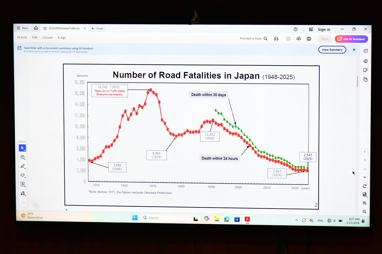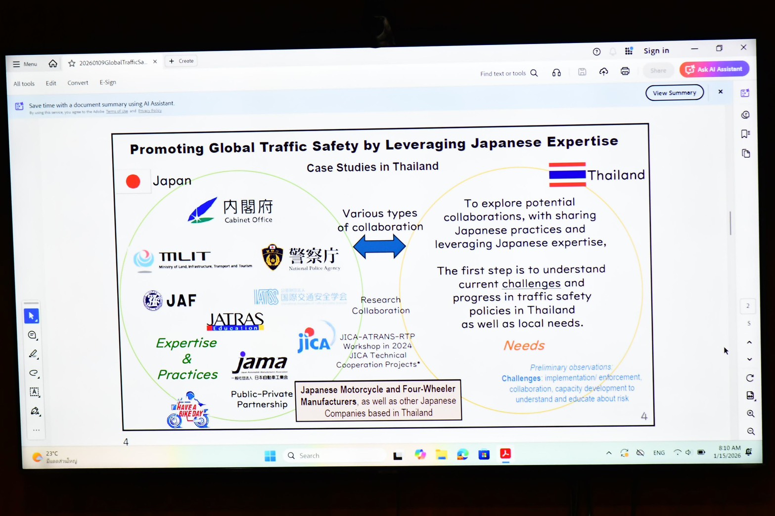 ทั้งนี้ จากการแลกเปลี่ยนประสบการณ์ พบว่าความท้าทายสำคัญของหลายประเทศ คือ การบังคับใช้กฎหมาย การประสานความร่วมมือระหว่างหน่วยงาน และการพัฒนาศักยภาพในการสื่อสารความเสี่ยงแก่ประชาชน โดยเฉพาะอุบัติเหตุรถจักรยานยนต์ ซึ่งมีปัจจัยเกี่ยวข้องอย่างซับซ้อน ทั้งพฤติกรรมผู้ขับขี่ ความเร็ว แอลกอฮอล์ การสวมหมวกนิรภัย โครงสร้างพื้นฐาน ยานพาหนะ กฎหมาย และสภาพแวดล้อมเมือง โดยกรุงเทพมหานครมีความพร้อมในการร่วมมือกับรัฐบาลญี่ปุ่น เพื่อพัฒนาองค์ความรู้ และสนับสนุนนโยบายบนฐานข้อมูลเชิงประจักษ์ (Evidence-Based Policy Making) เพื่อร่วมกันขับเคลื่อนเป้าหมายสูงสุด คือ “ถนนปลอดภัย ไม่มีผู้เสียชีวิตจากอุบัติเหตุทางถนน”