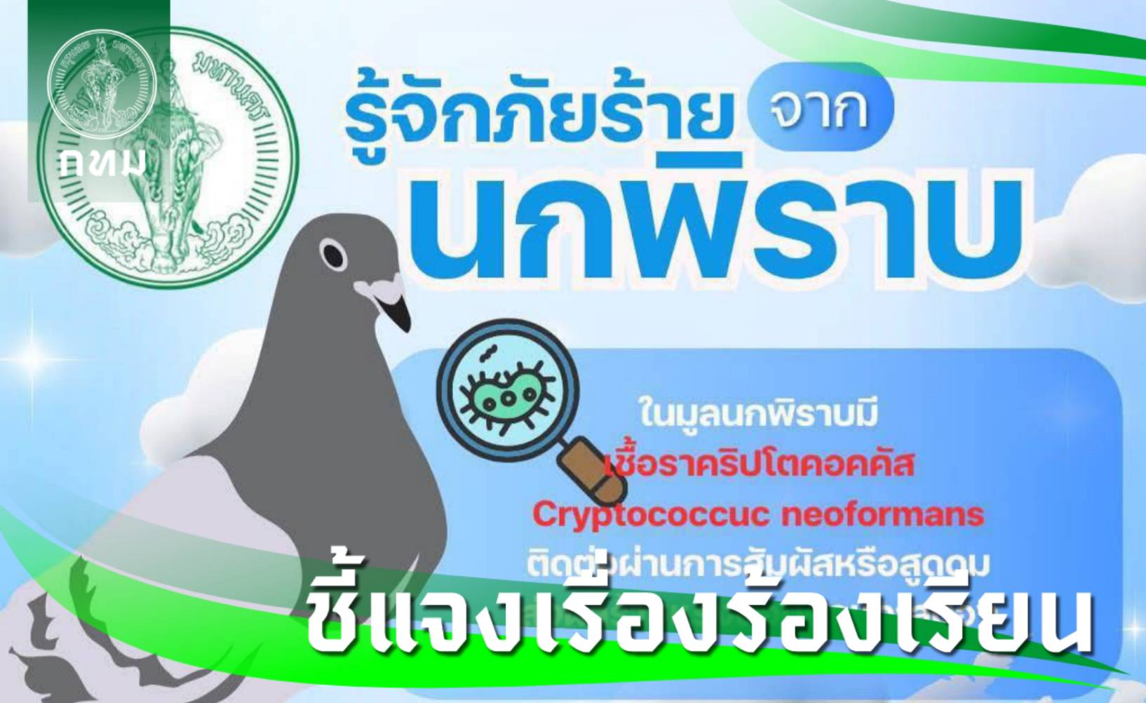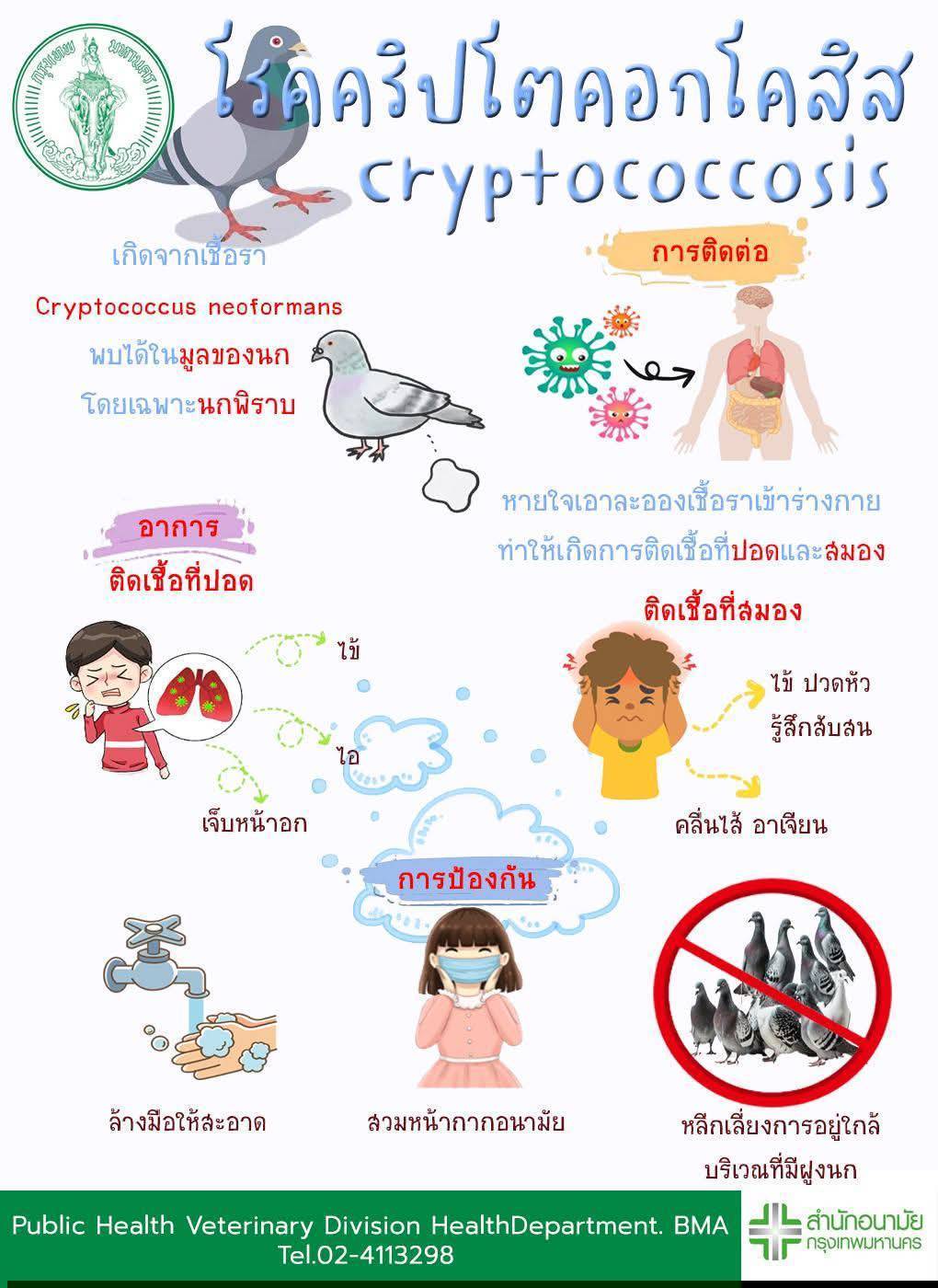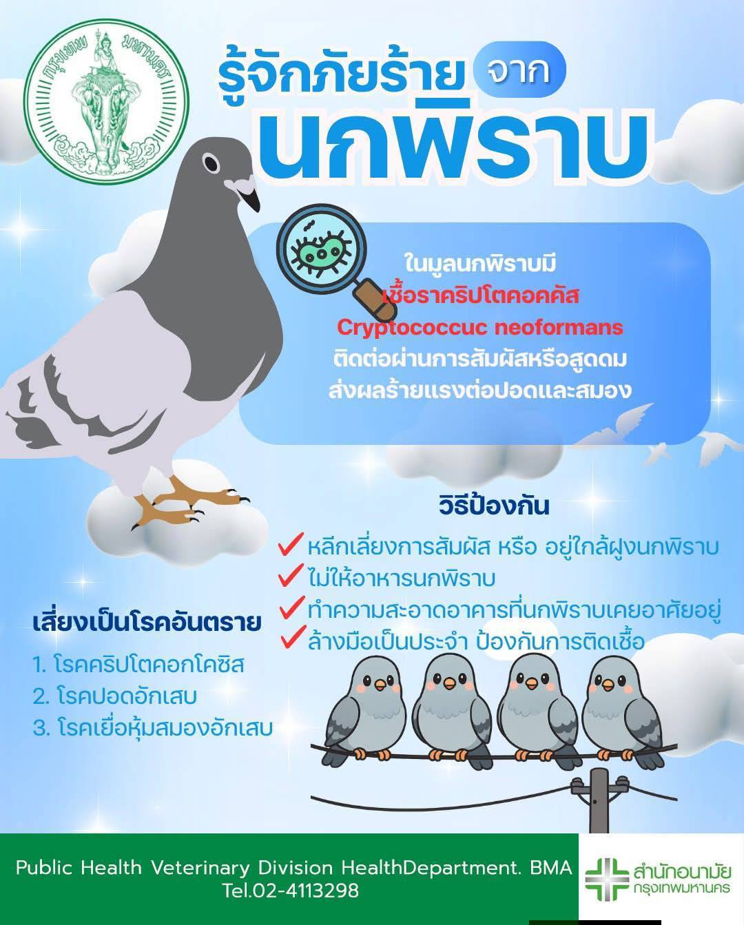 นางดวงพร ปิณจีเสคิกุล ผู้อำนวยการสำนักอนามัย (สนอ.) กทม. กล่าวถึงแนวทางการส่งเสริมความรู้และให้คำแนะนำแก่ประชาชนเกี่ยวกับอันตรายของเชื้อโรคและภัยสุขภาพจากนกพิราบและนกชนิดต่าง ๆ เพื่อป้องกันเชื้อโรคที่มากับนก ซึ่งอาจเป็นอันตรายต่อสุขภาพอนามัยของประชาชนว่า สนอ. จัดทำแนวทางส่งเสริมความรู้ให้แก่ประชาชนเกี่ยวกับอันตรายของเชื้อโรคและการป้องกันตนเองให้ปลอดภัยจากเชื้อโรคของนกพิราบ เผยเเพร่ประชาสัมพันธ์ข้อมูลการป้องกันการติดเชื้อจากนกพิราบ โดยการเว้นระยะห่างและหลีกเลี่ยงการสัมผัสกับนกพิราบ หรือมูล หรือสิ่งคัดหลั่งของนกพิราบ หลีกเลี่ยงการอยู่ในบริเวณที่มีนกพิราบอาศัยอยู่จำนวนมาก สวมหน้ากาก หรืออุปกรณ์ป้องกันที่เหมาะสมเมื่ออยู่ในพื้นที่ที่มีนกพิราบ กรณีสัมผัสนก หรือสิ่งคัดหลั่งของนกให้รีบล้างมือให้สะอาด หากจำเป็นต้องทำความสะอาดที่พักอาศัยที่มีมูลนกพิราบ ให้สวมใส่อุปกรณ์ป้องกันตนเองพร้อมทั้งหน้ากากอนามัย ถุงมือ และแว่นตา จากนั้นพรมน้ำให้คราบมูลนกอ่อนตัวลง ขัดทำความสะอาดและฆ่าเชื้อด้วยน้ำยาที่มีส่วนผสมของสารฟอกขาว (เช่น ไฮเตอร์) หรือน้ำยาฆ่าเชื้อทั่วไป