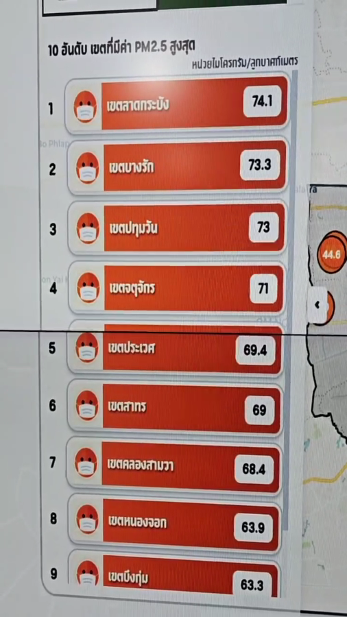 ผู้ว่าฯ ชัชชาติ กล่าวว่า สถานการณ์ดีขึ้นเล็กน้อย เช้านี้ไม่มีพื้นที่สีแดง แต่ยังมีพื้นที่สีส้มอยู่บ้าง โดยเมื่อวานนี้ทางฝั่งตะวันออกอย่างเขตลาดกระบัง มีค่าฝุ่นสีแดงพุ่งสูงขึ้น แต่ปัจจุบันลดลงมาเป็นสีส้ม