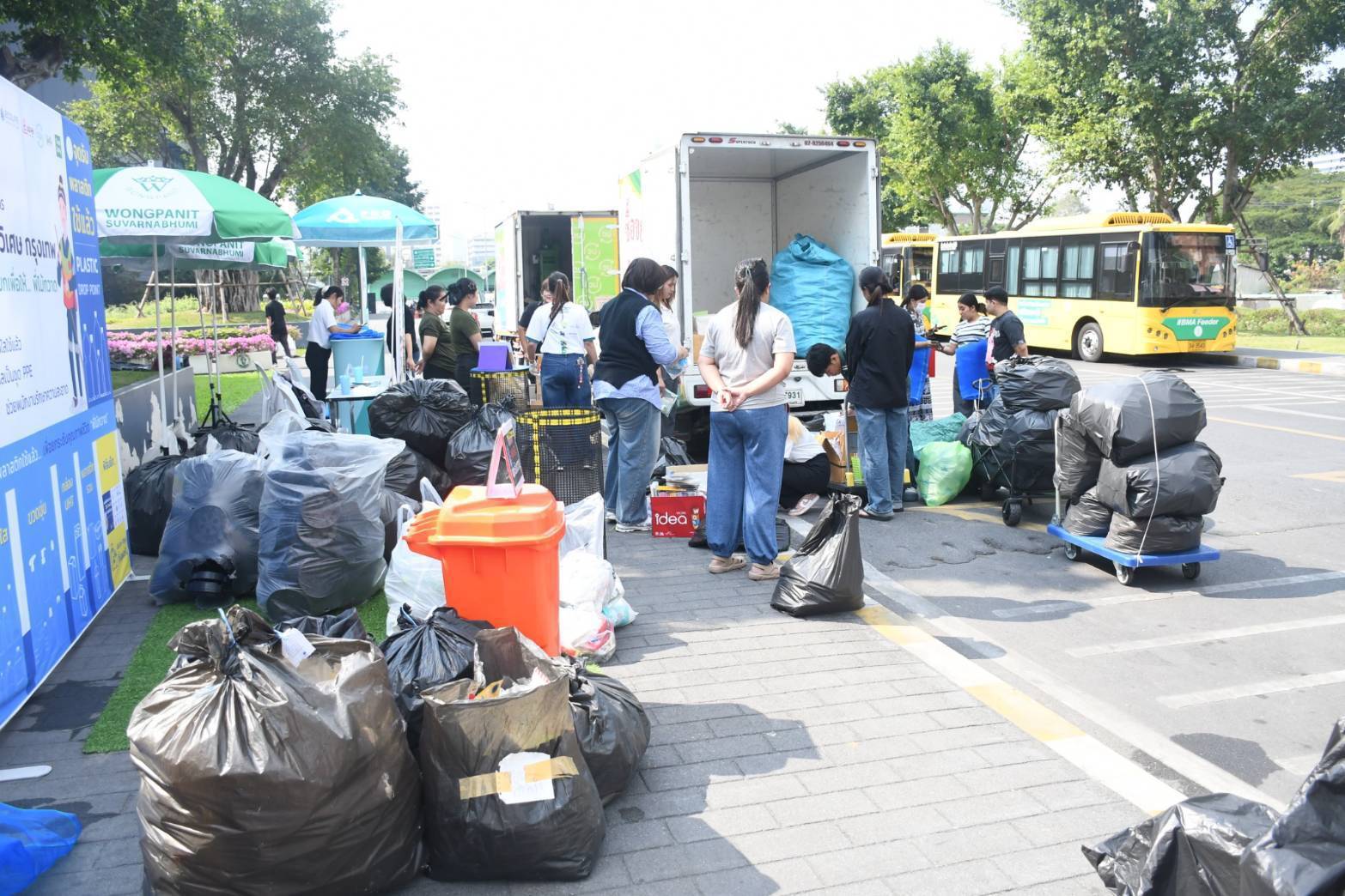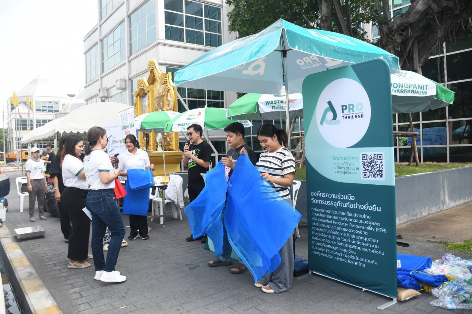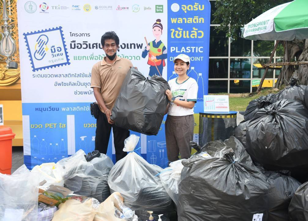 โดยวันนี้มีภาคีเครือข่ายร่วมรับมอบส่งต่อขยะเข้าสู่ระบบการจัดการอย่างถูกต้อง ได้แก่ 1. ภาคีมือวิเศษกรุงเทพ X โครงการวน เปิดรับกล่อง UHT ซองวิบวับ เพื่อแยกองค์ประกอบขยะ และนำไปผลิตเป็นวัสดุก่อสร้าง อาทิ อิฐรีไซเคิล หลังคาเมทัลชีท พร้อมด้วย บริษัท แอดวานซ์ แมท จำกัด นำผลิตภัณฑ์ อาทิ เก้าอี้ กล่องใส่ทิชชู ที่แปรรูปพลาสติกเคลือบฟรอยด์ ร่วมจัดแสดง 2. Yolo เปิดรับบริจาคพลาสติกแห้งและสะอาดทุกชนิด เพื่อนำไปคัดแยกและรีไซเคิลเป็นผลิตภัณฑ์หลากหลาย 3. Waste Buy Delivery รับซื้อขยะรีไซเคิลในราคาพิเศษ หรือหากต้องการบริจาค เพื่อนำรายได้จากการขายเข้าร่วมโครงการมือวิเศษกรุงเทพ แยกเพื่อให้…พี่ไม้กวาด เป็นเงินสนับสนุนการผลิตเสื้อสะท้องแสงสำหรับสวมใส่ในการปฏิบัติงานของเจ้าหน้าที่ฝ่ายรักษาความสะอาดและสวนสาธารณะของกรุงเทพมหานคร ได้เช่นกัน 4. ร่วมสนุกกับ PRO-Thailand Network “เครือข่ายองค์กรความร่วมมือจัดการบรรจุภัณฑ์อย่างยั่งยืน” รับถุงตาข่ายยักษ์กลับบ้านฟรี อีกทั้ง PRO-Thailand ยังให้การสนับสนุนชุดอาหารและน้ำดื่ม เติมใจ FOOD สำหรับเจ้าหน้าที่ โดยการใช้บรรจุภัณฑ์ที่สามารถเก็บกลับมาใช้ใหม่ เพื่อลดการใช้พลาสติกตั้งแต่ต้นทางสำหรับการจัดกิจกรรมของกรุงเทพมหานคร