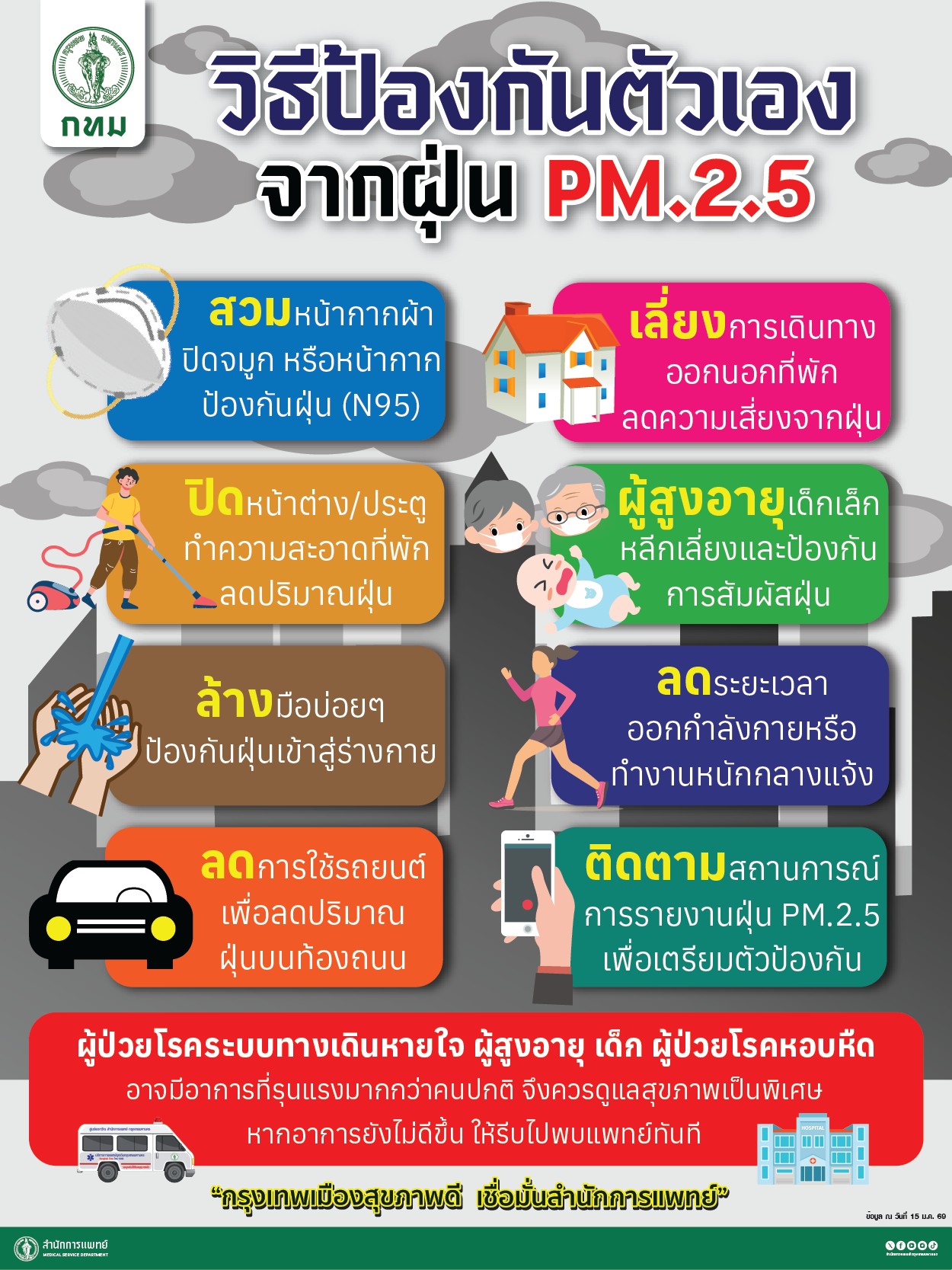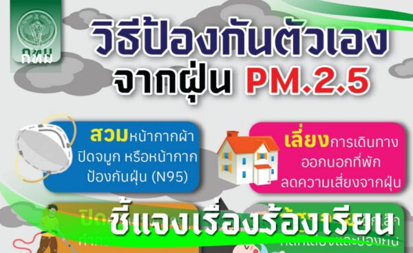 สนพ. ได้เน้นย้ำประชาชนให้ป้องกันดูแลสุขภาพในช่วงฝุ่น PM2.5 หนาแน่น โดยเฉพาะกลุ่มเปราะบางที่มีความเสี่ยงสูง เช่น เด็กเล็ก หญิงตั้งครรภ์ ผู้สูงอายุ ผู้ป่วยโรคภูมิแพ้ หอบหืด เยื่อบุตาอักเสบ หัวใจและหลอดเลือด รวมทั้งผู้ที่ทำงานกลางแจ้งเป็นเวลานานควรหลีกเลี่ยงพื้นที่ฝุ่นสูง หรือลดระยะเวลาออกนอกอาคารให้น้อยที่สุด หากจำเป็นต้องออกนอกอาคารให้สวมหน้ากากป้องกันฝุ่น ตลอดจนงดการทำกิจกรรม หรือออกกำลังกายกลางแจ้ง รวมทั้งปิดประตูหน้าต่างให้สนิท หรืออยู่ในห้องปลอดฝุ่นและสังเกตอาการตนเอง หากมีอาการไอ แน่นหน้าอก วิงเวียนศีรษะ คลื่นไส้ อาเจียน ผื่นแดง หรือมีอาการผิดปกติทางร่างกายอื่น ๆ ควรรีบพบแพทย์ทันที หรือพบแพทย์ผ่านทาง Telemedicine แอปพลิเคชัน “หมอ กทม.” เพื่อรับการตรวจวินิจฉัยอาการได้อย่างรวดเร็ว สามารถปรึกษาเรื่องสุขภาพ โทร. HOTLINE 1646 สายด่วนสุขภาพ สนพ. ให้บริการตลอด 24 ชั่วโมง