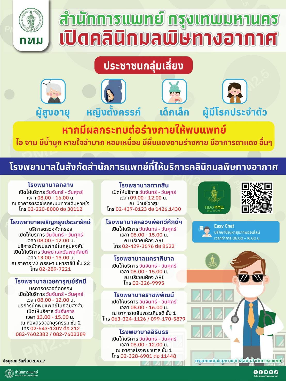 นายเกรียงไกร ตั้งจิตรมณีศักดา ผู้อำนวยการสำนักการแพทย์ (สนพ.) กทม. กล่าวถึงความคืบหน้าการดำเนินงานด้านการป้องกันและลดผลกระทบต่อสุขภาพจากปัญหาฝุ่น PM2.5 โดยเฉพาะในช่วงสถานการณ์ค่าฝุ่น PM2.5 สูงว่า สนพ. ได้เตรียมแผนปฏิบัติการป้องกันรองรับสถานการณ์ฝุ่น PM2.5 ตามมาตรการ ประกอบด้วย เปิดศูนย์ปฏิบัติการการแพทย์ฉุกเฉินด้านสาธารณสุข กรณีฝุ่น PM 2.5 เกิน 75 ไมโครกรัมต่อลูกบาศก์เมตร (มคก./ลบ.ม.) มอบหมายโรงพยาบาลในสังกัด กทม. เปิดคลินิกมลพิษทางอากาศ ได้แก่ โรงพยาบาลกลาง โทร 0 2220 8000 ต่อ 30112 (วันจันทร์ – วันศุกร์ เวลา 08.00 – 16.00 น.) โรงพยาบาลตากสิน โทร. 0 2437 0123 ต่อ 1426, 1430 (วันจันทร์-วันศุกร์ เวลา 09.00 – 12.00 น.) โรงพยาบาลเจริญกรุงประชารักษ์ โทร. 0 2289 7221 บริการตรวจคัดกรอง (วันจันทร์ – วันศุกร์ เวลา 08.00 – 12.00 น.) บริการนัดพบแพทย์ในกลุ่มสงสัย (วันพุธ – วันพฤหัสบดี เวลา 13.00 – 15.00 น.) โรงพยาบาลหลวงพ่อทวีศักดิ์ ชุตินฺธโร อุทิศ โทร. 0 2429 3576 ต่อ 8522 (วันจันทร์ – วันศุกร์ เวลา 08.00 – 15.00 น.) โรงพยาบาลเวชการุณย์รัศมิ์ โทร. 0 2543 1307 ต่อ 212, 082 760 2382 หรือ 082 760 2389 บริการตรวจคัดกรอง (วันจันทร์-วันศุกร์ เวลา 08.00 – 12.00 น.) บริการนัดพบแพทย์ในกลุ่มสงสัย (วันอังคาร เวลา 13.00 – 15.00 น.) โรงพยาบาลนคราภิบาล โทร.0 2326 9995 (วันจันทร์-วันศุกร์ เวลา 08.00 – 15.00 น.) โรงพยาบาลราชพิพัฒน์ โทร. 063 324 1126 หรือ 099 170 5879 (วันจันทร์-วันศุกร์ เวลา 08.00 – 16.00 น.) และโรงพยาบาลสิรินธร โทร.0 2328 6901 ต่อ 11448 (วันจันทร์ – วันศุกร์ เวลา 08.00 – 12.00 น.) เพื่อให้คำปรึกษาแก่ประชาชน ให้บริการตรวจรักษา ลดความรุนแรงของอาการที่เกิดจากฝุ่นละอองขนาดเล็ก