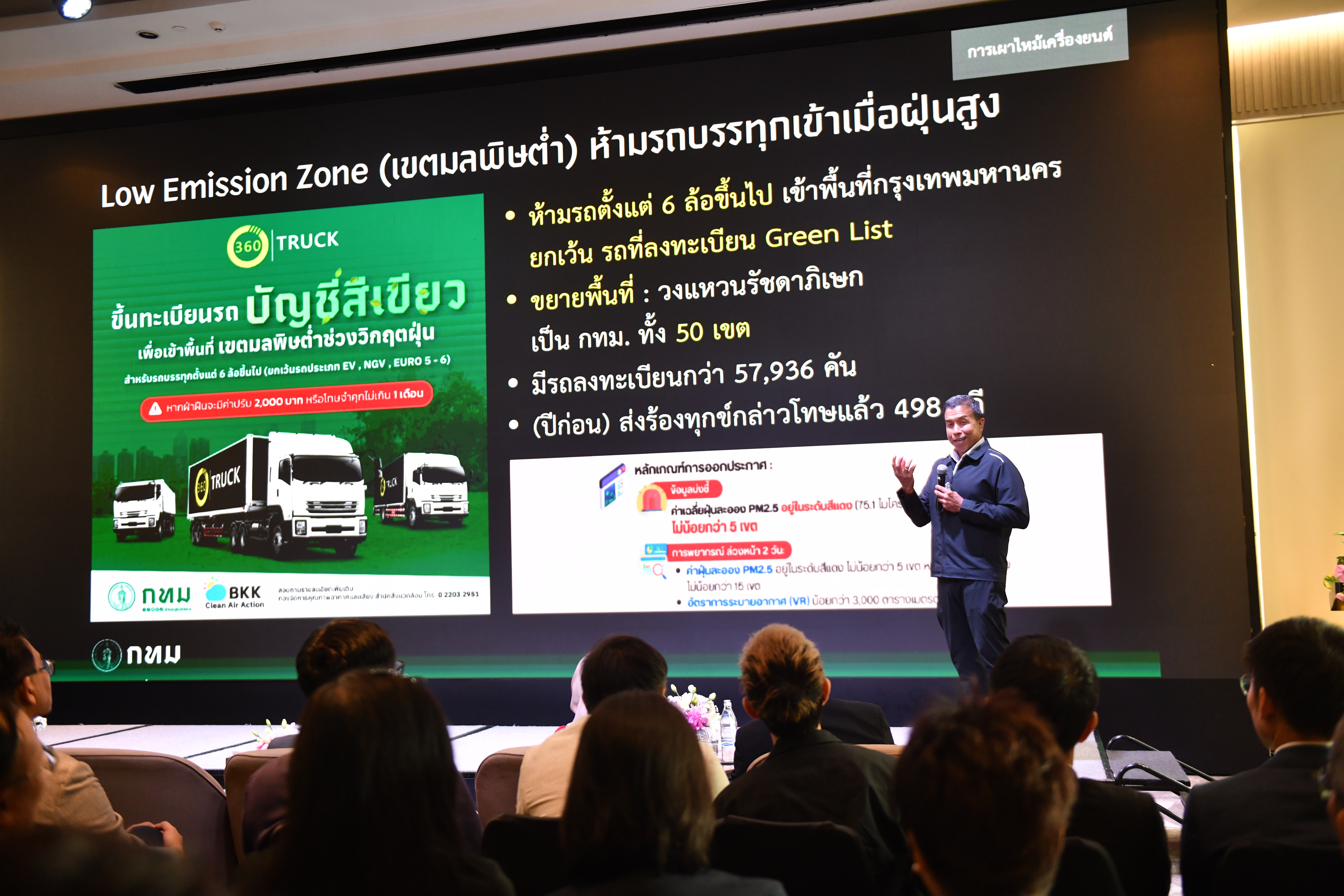 - เทคโนโลยีควบคุมแหล่งกำเนิดฝุ่น (Source Control) ได้แก่ Traffy Fondue: นวัตกรรมยอดฮิตที่เปิดให้ประชาชนถ่ายรูปและแจ้งเบาะแสการเผาขยะในที่โล่ง หรือรถเมล์ควันดำ โดยระบบจะส่งพิกัดไปยังเจ้าหน้าที่เขตเพื่อเข้าไประงับเหตุได้ทันที ระบบ CEMS (Continuous Emission Monitoring System): ให้โรงงานขนาดใหญ่ใน กทม. ติดตั้งเครื่องตรวจวัดการระบายมลพิษแบบต่อเนื่อง เพื่อส่งข้อมูลการปล่อยควันแบบเรียลไทม์มายังส่วนกลาง Low Emission Zone (LEZ): ใช้ระบบคัดกรองรถยนต์ที่ผ่านเข้าเขตมลพิษต่ำที่กำหนด (เช่น เขตปทุมวัน และขยายผลสู่ 50 เขต) โดยมีการใช้ระบบลงทะเบียน “บัญชีสีเขียว” (Green List) สำหรับรถบรรทุกที่ผ่านการตรวจสภาพเพื่ออนุญาตให้เข้าพื้นที่ได้