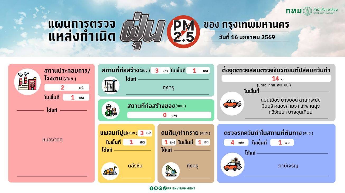 เมื่อวันที่ 9 ม.ค. 69 ปลัดกรุงเทพมหานคร ได้มีหนังสือสั่งการให้ทุกหน่วยงานที่เกี่ยวข้องดำเนินมาตรการ เพื่อลดและควบคุมฝุ่นละอองที่แหล่งกำเนิด อาทิ เข้มงวดการตรวจสถานที่ก่อสร้างให้การฉีดพ่นน้ำ งดกิจกรรมก่อสร้างที่ก่อให้เกิดฝุ่นละออง และรถตั้งแต่ 6 ล้อขึ้นไปต้องลงทะเบียนบัญชีสีเขียว (Green List) ตรวจติดตามแหล่งกำเนิด PM2.5 ทุกประเภท ไม่ให้ปล่อยมลพิษอากาศเกินค่ามาตรฐานที่กฎหมายกำหนด เข้มงวดตรวจตราไม่ให้มีการเผาขยะ หรือการเผาในที่โล่ง ขอความร่วมมือให้บุคลากรภาครัฐและเอกชนปฏิบัติงานในที่พัก (Work From Home) ในวันที่ 12-13 ม.ค. 69 ผู้อำนวยการเขตพิจารณาออกประกาศพื้นที่ควบคุมเหตุรำคาญ ความถี่ในการล้างและดูดฝุ่นถนน ฉีดล้างต้นไม้ ใบไม้ ออกหน่วยบริการสาธารณสุขและหน่วยแพทย์เคลื่อนที่ คลินิกมลพิษทางอากาศดูแลสุขภาพประชาชน และแจ้งโรงเรียน ศูนย์เด็กเล็กก่อนวัยเรียนในพื้นที่ งดกิจกรรมกลางแจ้งทุกประเภท และให้เด็กเล็กหรือกลุ่มเสี่ยงอยู่ในห้องปลอดฝุ่น ซึ่งสำนักงานเขตได้ดำเนินการตรวจแหล่งกำเนิดฝุ่นละออง PM2.5 ระหว่างวันที่ 10-14 ม.ค. 69 ประกอบด้วย สถานประกอบกิจการ 206 ครั้ง แพลนท์ปูน 151 ครั้ง สถานที่ก่อสร้าง 183 ครั้ง ถมดิน/ท่าทราย 13 ครั้ง และตรวจควันดำในสถานที่ต้นทาง 146 คัน พบรถปล่อยควันดำเกินมาตรฐานและขอให้ปรับปรุงแก้ไข 17 คัน