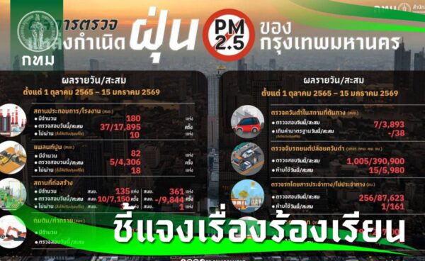 นางสาววรนุช สวยค้าข้าว ผู้อำนวยการสำนักสิ่งแวดล้อม (สสล.) กทม. กล่าวถึงความคืบหน้าการขับเคลื่อนการดำเนินงานแก้ไขปัญหาฝุ่นละออง PM2.5 ในพื้นที่กรุงเทพฯ ว่า กทม. ได้บูรณาการความร่วมมือกับหน่วยงานที่เกี่ยวข้องขับเคลื่อนมาตรการตามแผนปฏิบัติการแก้ไขปัญหาฝุ่น PM2.5 ในพื้นที่กรุงเทพฯ ปี 2569 ภายใต้แผนปฏิบัติการขับเคลื่อนวาระแห่งชาติ “การแก้ไขปัญหามลพิษด้านฝุ่นละออง” ฉบับที่ 2 พ.ศ. 2568 – 2570 และระยะ 5 ปีต่อไป และแผนปฏิบัติการเพื่อลดและขจัดมลพิษในเขตควบคุมมลพิษภายใต้ประกาศคณะกรรมการสิ่งแวดล้อมแห่งชาติ เมื่อวันที่ 8 ก.ย. 68 ที่กำหนดให้ท้องที่เขตกรุงเทพฯ เป็นเขตควบคุมมลพิษ ในเดือน พ.ย. – มี.ค. ของทุกปี โดยในปีงบประมาณ พ.ศ.2569 กทม. ได้ยกระดับ 10 มาตรการ เพื่อลดและควบคุมปัญหาฝุ่นละออง PM2.5 เพื่อบรรเทาความรุนแรงของสถานการณ์ และลดผลกระทบต่อสุขภาพของประชาชน ประกอบด้วย (1) มาตรการเขตมลพิษต่ำ (Low Emission Zone: LEZ) ขยายพื้นที่จากเดิมวงแหวนรัชดาภิเษกเป็นครอบคลุมทั้ง 50 เขตของกรุงเทพฯ โดยห้ามรถตั้งแต่ 6 ล้อขึ้นไปเข้าพื้นที่กรุงเทพฯ ภายใต้หลักเกณฑ์และเงื่อนไขที่กำหนด ยกเว้นรถที่ลงทะเบียนบัญชีสีเขียว (Green List) ที่สามารถเข้าพื้นที่ได้ โดยเปิดให้ลงทะเบียนทางเว็บไซต์ https://lez.bangkok.go.th ตั้งแต่บัดนี้ถึงเดือน มี.ค. 69 มีรถลงทะเบียนแล้วกว่า 30,000 คัน (2) โครงการ Green List Plus ส่งเสริมให้ประชาชนมีส่วนร่วมลดฝุ่นจากยานพาหนะ โดยเปลี่ยนน้ำมันเครื่องและไส้กรองอากาศ พร้อมทั้งลงทะเบียน Green List Plus ที่ศูนย์รับบริการที่เข้าร่วมโครงการ ซึ่งจะได้รับสิทธิประโยชน์ต่าง ๆ จากภาคเอกชนที่ร่วมโครงการ ตั้งแต่บัดนี้ถึงเดือน ม.ค. 69 มีรถลงทะเบียนเข้าร่วมโครงการแล้วกว่า 186,000 คัน (3) มาตรฐานควันดำ กระทรวงทรัพยากรธรรมชาติและสิ่งแวดล้อม (ทส.) ได้ประกาศมาตรฐานค่าควันดำใหม่ ไม่เกินร้อยละ 20 จากเดิมร้อยละ 30 ซึ่งมีผลบังคับใช้เมื่อวันที่ 1 พ.ย. 68 ที่ผ่านมา โดยได้เรียกตรวจรถควันดำตามมาตรฐานใหม่แล้วกว่า 34,000 คัน พบรถมีค่าเกินมาตรฐานและออกคำสั่งห้ามใช้ 534 คัน (4) การตรวจรถในไซต์ก่อสร้าง/สถานประกอบการ สำนักงานเขตและสำนักการโยธา (สนย.) ได้ดำเนินการสุ่มตรวจควันดำรถที่ใช้งานอย่างต่อเนื่อง โดยเฉพาะในช่วงฤดูฝุ่น และประชาสัมพันธ์ให้รถที่ใช้งานทุกคันต้องลงทะเบียนบัญชีสีเขียว (Green List) กับ กทม. (5) การจัดการมลพิษในโรงงานและสถานประกอบกิจการที่มีหม้อไอน้ำทุกแห่งในพื้นที่กรุงเทพฯ จะต้องติดตั้งระบบตรวจวัดมลพิษทางอากาศที่ปล่อยจากปล่องอัตโนมัติอย่างต่อเนื่อง (CEMS) และเพิ่มความเข้มข้นของมาตรฐานมลพิษจากปล่องหม้อน้ำ ได้แก่ ค่า TSP SO2 และ NOx ซึ่งก