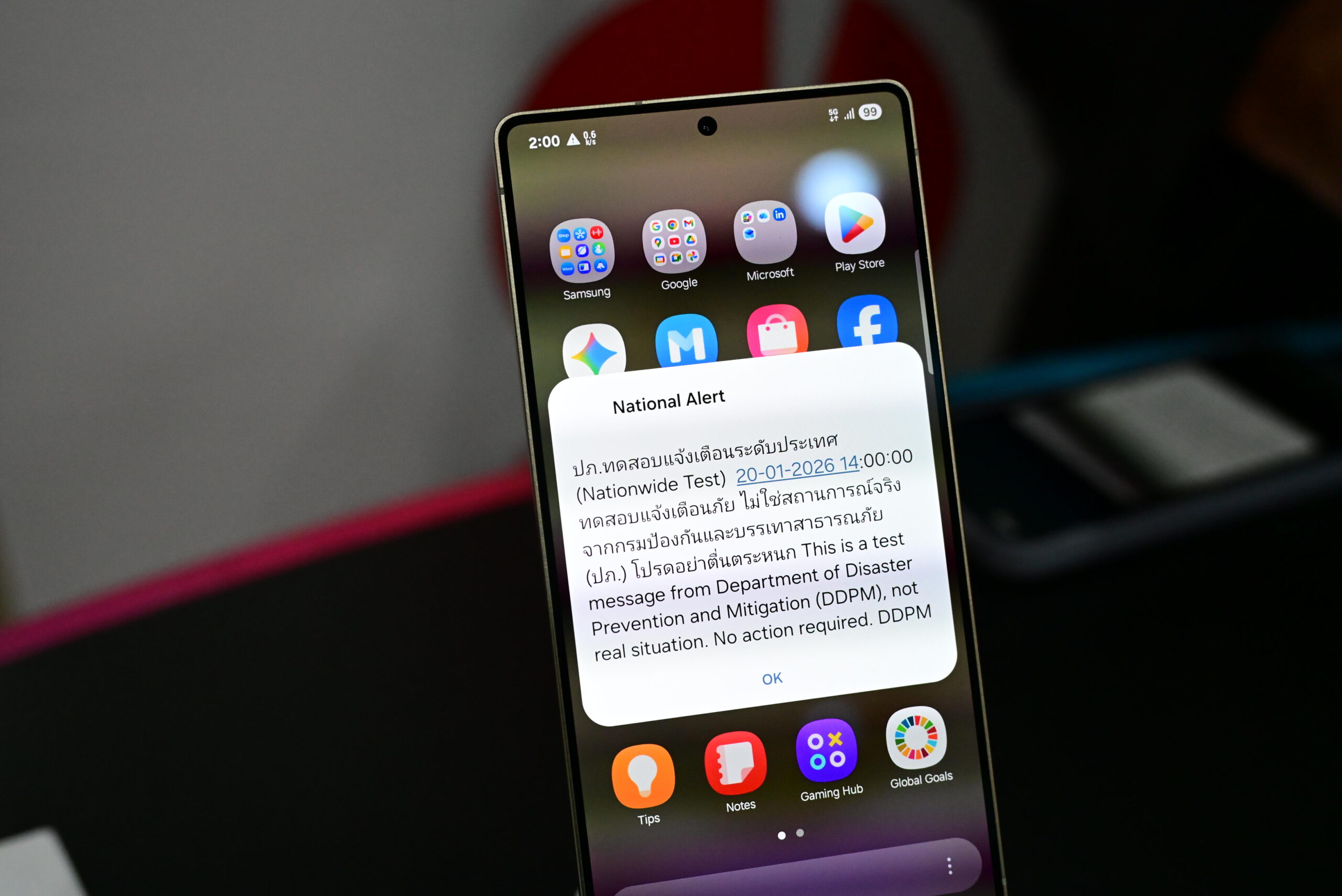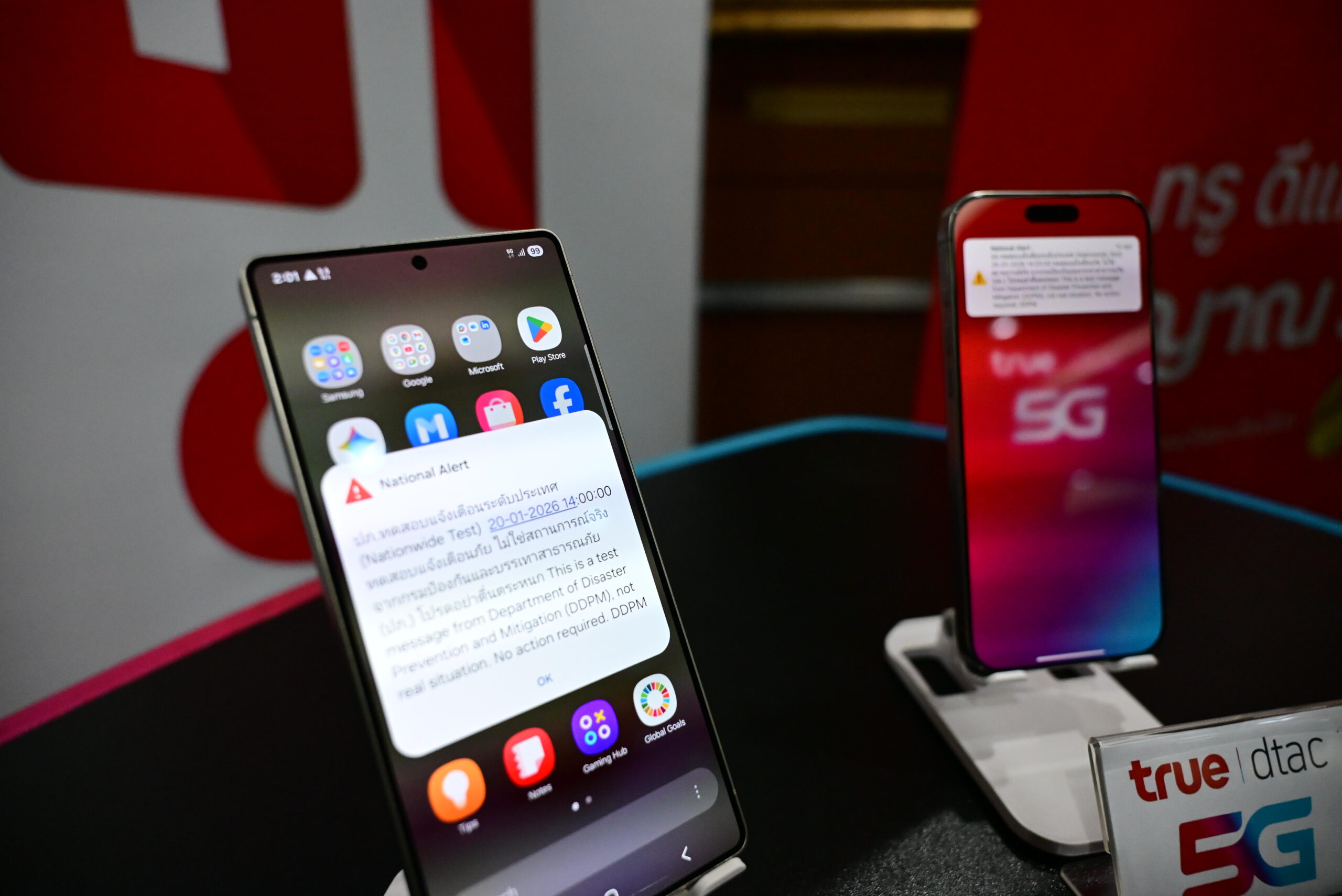 สำหรับวันนี้กรมป้องกันและบรรเทาสาธารณภัย (ปภ.) ทำการทดสอบระบบแจ้งเตือนภัยผ่าน Cell Broadcast ระดับประเทศ (Nationwide Test) ครอบคลุมพื้นที่ทั่วประเทศ 76 จังหวัดและกรุงเทพมหานคร เพื่อทดสอบความพร้อมของระบบแจ้งเตือนภัยในระดับประเทศ เป็นการแจ้งเตือนแบบ National Alert หรือการแจ้งเตือนภัยระดับชาติ ซึ่งจะใช้แจ้งเตือนสถานการณ์สาธารณภัยขนาดใหญ่ที่มีความรุนแรง และส่งผลกระทบต่อหลายพื้นที่ สำหรับการแจ้งเตือนประชาชนจะได้รับเสียงสัญญาณแจ้งเตือนและข้อความอัตโนมัติความยาวประมาณ 8 วินาที ในเวลา 14.00 น. พร้อมกัน แม้โทรศัพท์จะปิดเสียง ล็อคหน้าจอ หรืออยู่ในโหมดสั่นก็จะได้รับการแจ้งเตือนผ่าน Cell Broadcast ซึ่งจะปรากฎข้อความว่า “ทดสอบแจ้งเตือนภัย ไม่ใช่สถานการณ์จริง จากกรมป้องกันและบรรเทาสาธารณภัย (ปภ.) โปรดอย่าตื่นตระหนก” และข้อความภาษาอังกฤษ “This is a test message from Department of Disaster Prevention and Mitigation (DDPM), not real situation. No action required.”