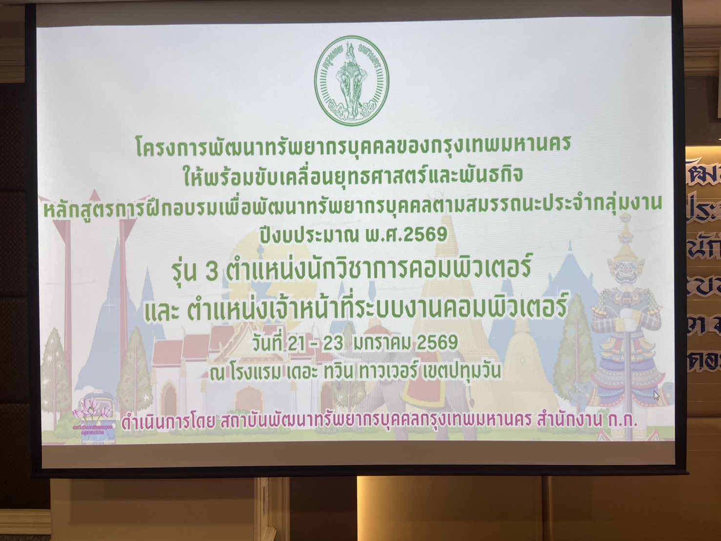 กรุงเทพมหานคร โดยสถาบันพัฒนาทรัพยากรบุคคลกรุงเทพมหานคร สำนักงานคณะกรรมการข้าราชการกรุงเทพมหานคร (สำนักงาน ก.ก.) จัดการฝึกอบรมหลักสูตรการฝึกอบรมเพื่อพัฒนาทรัพยากรบุคคลตามสมรรถนะประจำกลุ่มงาน ประจำปีงบประมาณ พ.ศ. 2569 สำหรับผู้ดำรงตำแหน่งนักวิชาการคอมพิวเตอร์ และเจ้าหน้าที่ระบบงานคอมพิวเตอร์ รุ่นที่ 3 เพื่อพัฒนาทรัพยากรบุคคลตามสมรรถนะประจำกลุ่มงาน คือ การพัฒนาทรัพยากรบุคคลเกี่ยวกับความรู้ที่จำเป็นต่อการปฏิบัติงาน เพื่อให้สามารถพัฒนา ความรู้ ทักษะ ตามสมรรถนะประจำกลุ่มงานของข้าราชการกรุงเทพมหานคร และสามารถนำความรู้ที่ได้รับไปปรับใช้ในการปฏิบัติงาน และแก้ไขปัญหาที่เกิดขึ้นได้อย่างมีประสิทธิภาพ กำหนดจัดระหว่างวันที่ 21-23 ม.ค.69 การอบรมเป็นแบบไป-กลับ ผู้เข้ารับการอบรมประกอบด้วย ข้าราชการสังกัดกรุงเทพมหานคร ตำแหน่งนักวิชาการคอมพิวเตอร์ และเจ้าหน้าที่ระบบงานคอมพิวเตอร์ จำนวน 40 คน ณ โรงแรม เดอะ ทวิน ทาวเวอร์ เขตปทุมวัน โดยได้รับเกียรติจากผู้ทรงคุณวุฒิจากภาครัฐและภาคเอกชนที่มีประสบการณ์และความเชี่ยวชาญในภารกิจด้านเทคโนโลยี