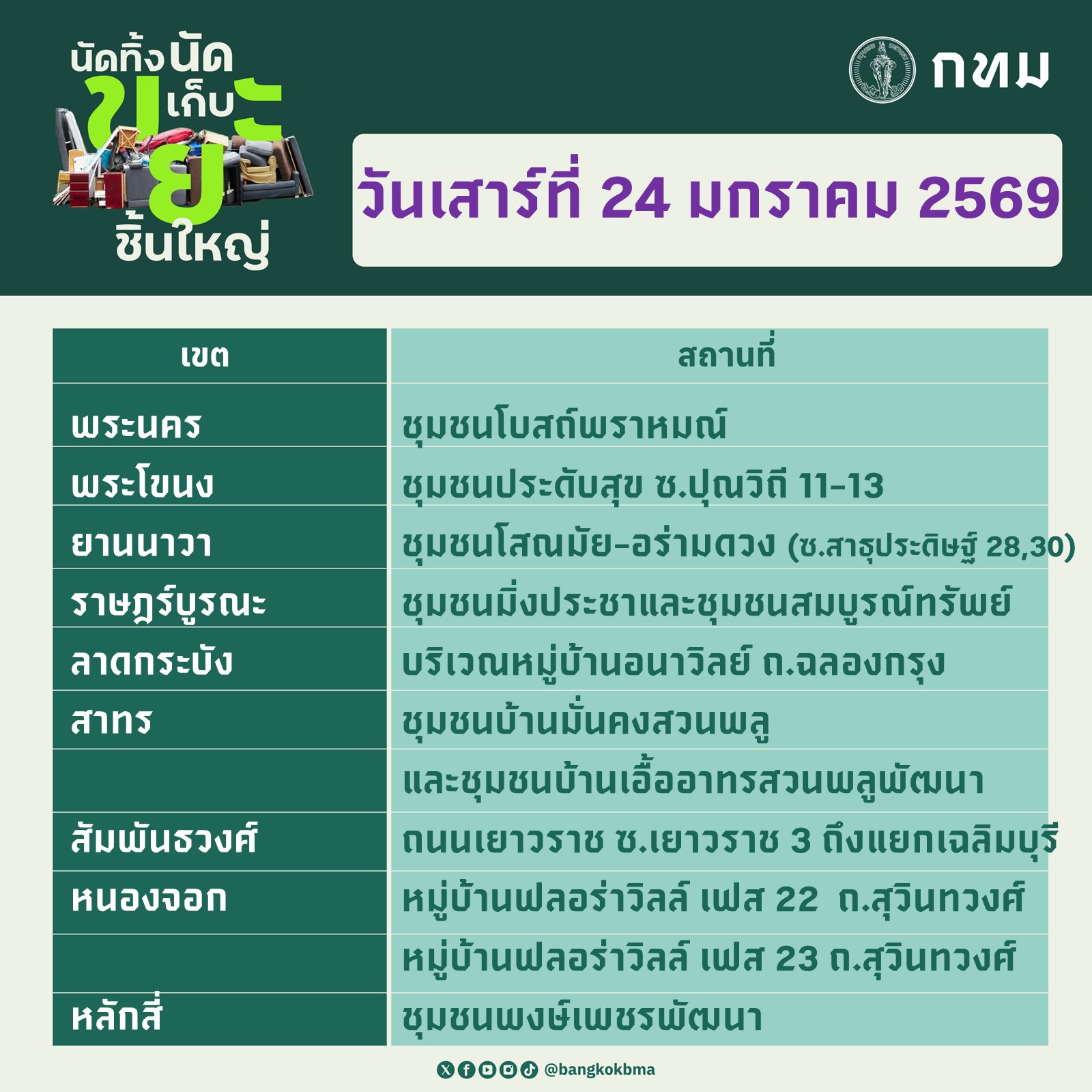 กทม.นัดทิ้ง นัดเก็บ ขยะชิ้นใหญ่ ประจำวันที่ 17-18 มกราคม 2569