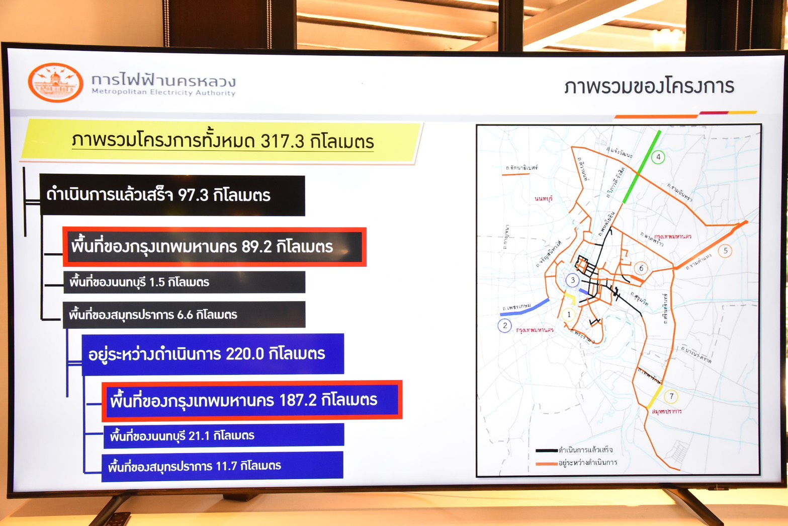 ผู้ว่าการการไฟฟ้านครหลวงกล่าวเพิ่มเติมว่า ปัจจุบัน MEA ดำเนินการเปลี่ยนระบบสายไฟฟ้าบนอากาศเป็นสายไฟฟ้าใต้ดินแล้วรวมระยะทาง 97.3 กิโลเมตร และในปี 2569 มีแผนดำเนินการเพิ่มเติมอีก 38.4 กิโลเมตร รวมเป็นระยะทางสะสม 135.7 กิโลเมตร โดยตั้งเป้าหมายเปลี่ยนระบบและรื้อถอนเสาสายตามเส้นทางที่ได้รับอนุมัติรวม 317.3 กิโลเมตร ภายในปี 2575