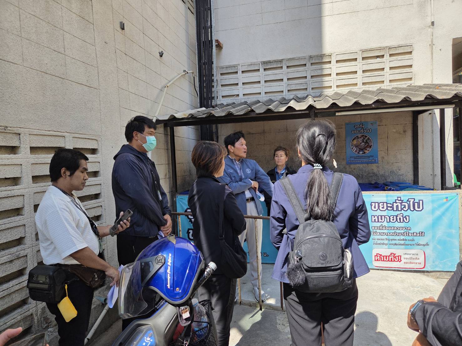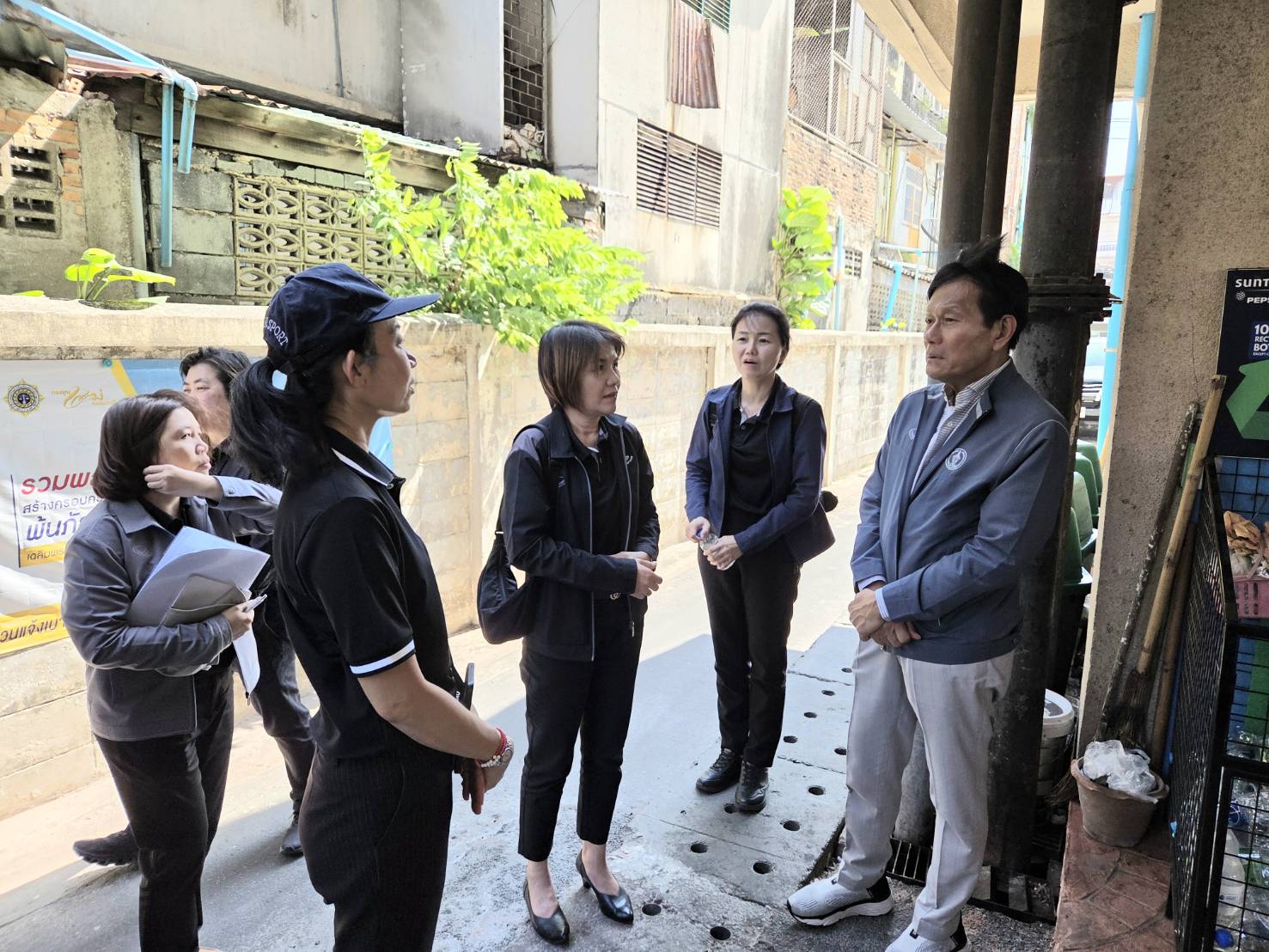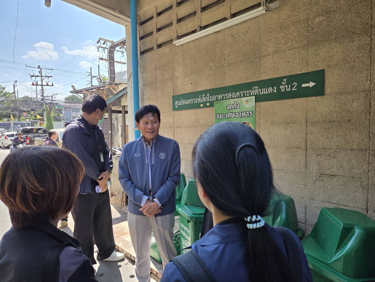 จากนั้นเยี่ยมชมการคัดแยกขยะ อาคารสงเคราะห์ข้าราชการและลูกจ้างประจำของกรุงเทพมหานคร ดินแดง ซึ่งเป็นอาคารชุดพักอาศัยความสูง 12 ชั้น ห้องพัก 154 ห้อง มีผู้พักอาศัย 115 ห้อง ไม่มีผู้พักอาศัย 39 ห้อง มีคณะกรรมการชุมชนเป็นผู้ดูแลประสานงาน จัดเก็บค่าธรรมเนียมคัดแยกขยะเป็นรายห้องตามเลขหมายประจำบ้าน ปริมาณขยะไม่เกิน 20 ลิตร/วัน/ห้อง ห้องพักที่ได้รับสิทธิ์แยกขยะลดค่าธรรมเนียมจ่าย 20 บาท/เดือน หากไม่ลงทะเบียนจ่ายค่าธรรมเนียม 60 บาท/เดือน สำหรับการลงทะเบียนคัดแยกขยะลดค่าธรรมเนียม เป็นการลงทะเบียนแบบเดี่ยว ลงทะเบียนรับสิทธิ์ 75 ห้อง ได้รับสิทธิ์ลดค่าธรรมเนียมแล้ว 46 ห้อง ส่งหลักฐานไม่ครบ 29 ห้อง (ไม่ส่งภาพ 26 ห้อง ภาพไม่ผ่าน 3 ห้อง) และไม่ลงทะเบียนรับสิทธิ์ 40 ห้อง วิธีการคัดแยกขยะ โดยจำแนกตามประเภทของขยะ ดังนี้ 1.ขยะรีไซเคิล มีกรงตาข่ายสำหรับทิ้งขยะรีไซเคิล ขนาด 1x1x1 เมตร จำนวน 2 กรง ติดตั้งบริเวณโถงอาคารชั้นล่าง ใกล้กับทางผ่านเข้า-ออกอาคาร สำหรับทิ้งขยะรีไซเคิลของผู้พักอาศัยที่ไม่ประสงค์นำไปขายเป็นรายได้ แบ่งออกเป็น กรงตาข่ายขยะขวด PET กรงตาข่ายทิ้งขยะรีไซเคิลอื่น ๆ เช่น แก้ว โลหะ กระดาษ พลาสติกขุ่น และพลาสติกอื่น ๆ 2.ขยะอันตราย ตั้งวางถังสำหรับใส่ขยะอันตรายขนาด 130 ลิตร จำนวน 1 ถัง บริเวณโถงอาคารชั้นล่าง ใกล้กับทางผ่านเข้า-ออกอาคาร เขตฯ จัดเก็บเดือนละ 1 ครั้ง 3.ขยะอินทรีย์ ตั้งวางถังสำหรับใส่ขยะเศษอาหารขนาด 100 ลิตร จำนวน 4 ถัง บริเวณภายนอกอาหาร เขตฯ จัดเก็บสัปดาห์ละ 2 ครั้ง วันพุธและวันอาทิตย์ 4.ขยะทั่วไป ตั้งวางถังขยะทั่วไป บริเวณคอกคอนกรีตภายนอกอาคาร เขตฯ จัดเก็บสัปดาห์ละ 2 ครั้ง วันพุธและวันอาทิตย์ สำหรับปริมาณขยะแยกประเภท ดังนี้ ขยะทั่วไปก่อนลงทะเบียนรับสิทธิ์ 1,088 ลิตร/วัน หลังลงทะเบียนรับสิทธิ์ 817 ลิตร/วัน ขยะรีไซเคิล เฉพาะส่วนที่ผู้พักอาศัยนำมาทั้งที่จุดทิ้งขยะรีไซเคิล 50 กิโลกรัม/2 เดือน ขยะเศษอาหาร 5 กิโลกรัม/วัน ขยะอันตราย 0.5-1 กิโลกรัม//เดือน