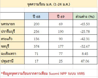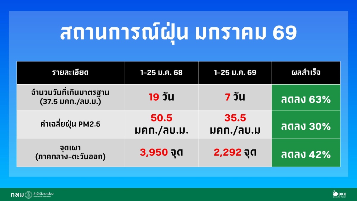 ทั้งนี้ หากเปรียบเทียบสถิติ เดือน ม.ค. ช่วงวันที่ 1 – 25 ปี 68 มีค่าฝุ่นสีส้ม (เกินค่ามาตรฐาน 37.5 มคก./ลบ.ม.) 19 วัน ปี 69 มีสีส้ม 7 วัน ลดลง 63% และช่วงเดียวกันนี้ ปี 68 ค่าเฉลี่ยฝุ่น 50.5 มคก./ลบ.ม. ปี 69 ค่าเฉลี่ยฝุ่น 35.5 มคก./ลบ.ม. ลดลง 30% ส่วนจุดเผา (ในประเทศไทย ภาคกลาง-ตะวันออก) ปี 68 มี 3,950 จุด ปี 69 มี 2,292 จุด ลดลง 42%