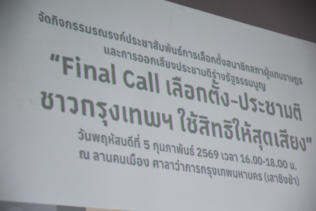 พร้อมกันนี้ กทม. เตรียมจัดกิจกรรมรณรงค์สร้างการรับรู้และการมีส่วนร่วมของประชาชนในช่วงโค้งสุดท้าย ในวันที่ 5 กุมภาพันธ์ 2569 ณ ลานคนเมือง ศาลาว่าการกรุงเทพมหานคร ภายใต้ชื่อกิจกรรม “Final Call เลือกตั้ง–ประชามติ คนกรุงเทพฯ ใช้สิทธิให้สุดเสียง” เพื่อเสริมสร้างความเข้าใจเกี่ยวกับกระบวนการเลือกตั้ง และส่งเสริมให้ประชาชนออกมาใช้สิทธิของตนเองตามระบอบประชาธิปไตย