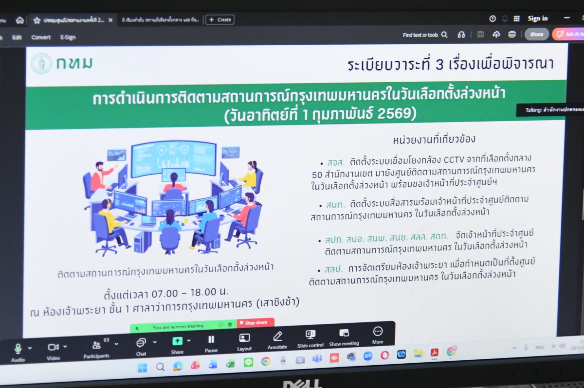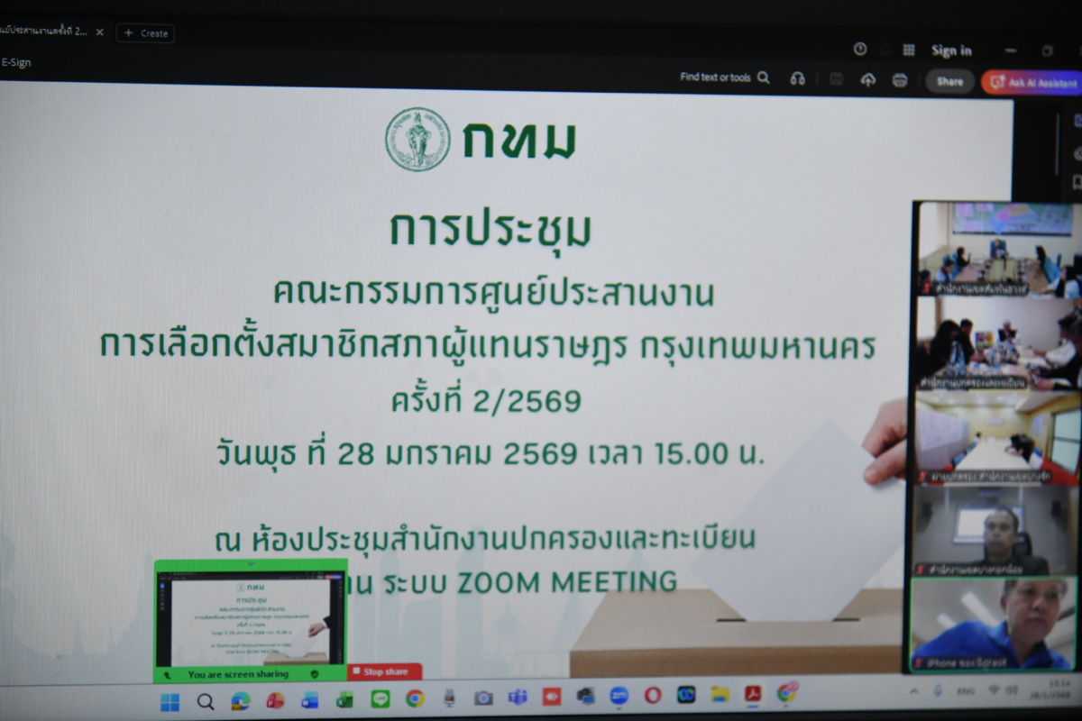 (28 ม.ค.69) เวลา 15.00 น. นายธนิต ตันบัวคลี่ รองปลัดกรุงเทพมหานคร เป็นประธานการประชุมคณะกรรมการศูนย์ประสานงานการเลือกตั้งสมาชิกสภาผู้แทนราษฎร กรุงเทพมหานคร ครั้งที่ 2/2569 ณ ห้องประชุมสำนักงานปกครองและทะเบียน ชั้น 5 ศาลาว่าการกรุงเทพมหานคร (เสาชิงช้า) และผ่านระบบออนไลน์ โดยมีผู้บริหารหน่วยงานที่เกี่ยวข้อง และสำนักงานเขตทั้ง 50 เขต เข้าร่วมประชุม