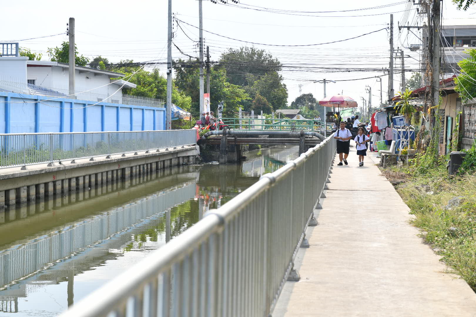 จุดที่ 1 โครงการก่อสร้างเขื่อน ค.ส.ล. คลองกำนันเทียน โครงการอยู่ในช่วงใกล้แล้วเสร็จ (98.5%) มีความก้าวหน้าเร็วกว่ากำหนดตามแผนงาน โดยมีเป้าหมายเพิ่มประสิทธิภาพการระบายน้ำ ลดความเสี่ยงปัญหาน้ำท่วมซ้ำซาก และเสริมความมั่นคงของตลิ่งตลอดแนวคลอง ซึ่งจะช่วยยกระดับความปลอดภัยและคุณภาพชีวิตของชุมชนโดยรอบอย่างเป็นรูปธรรม